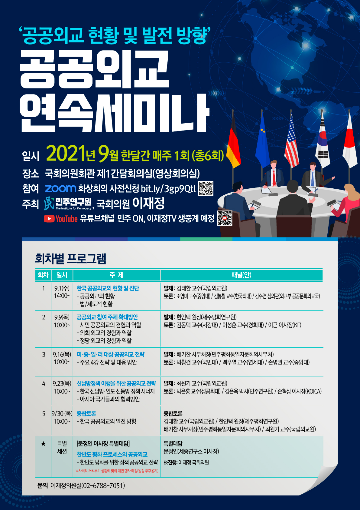 9월 1일(수) 14시부터 1회차 세미나(한국 공공외교의 현황 및 진단)가 진행되며, ZOOM 화상회의 및 유튜브 채널 '민주ON' 과 ‘이재정 TV’로 생중계될 예정입니다.