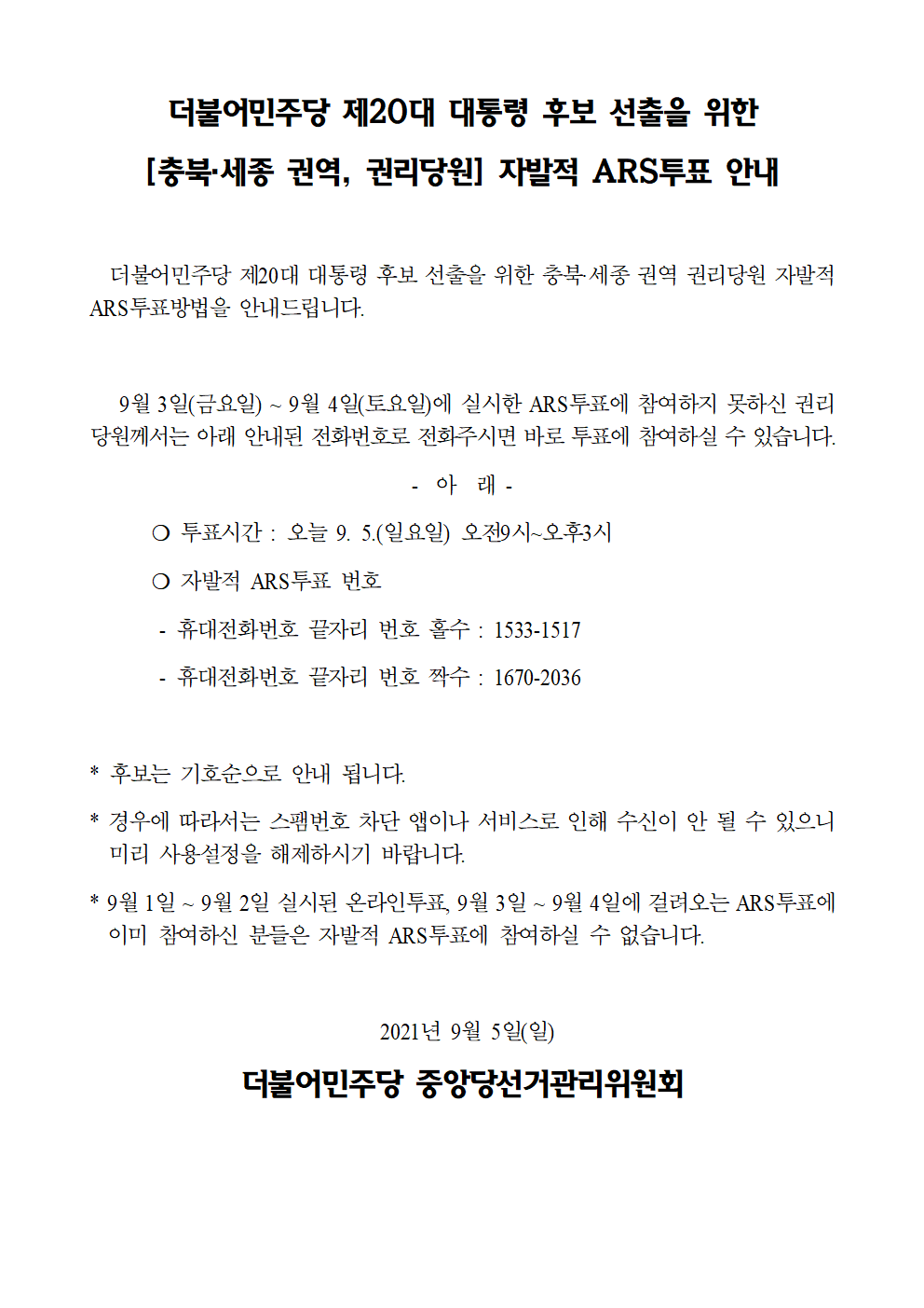 더불어민주당 제20대 대통령후보 선출을 위한 [세종·충북 권역, 권리당원] 자발적 ARS투표 안내