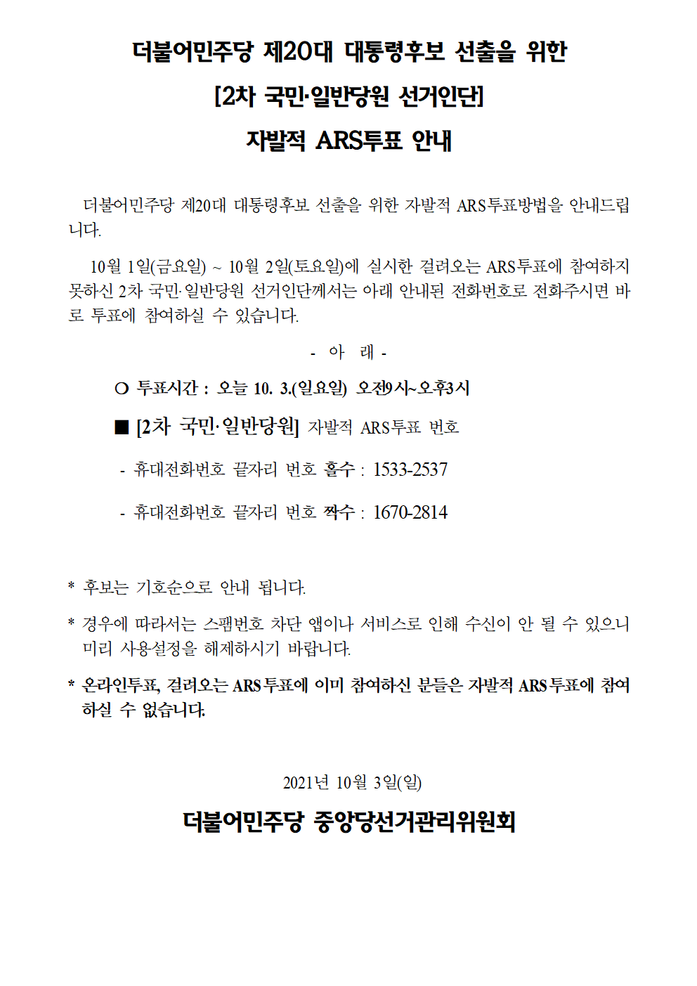 더불어민주당 제20대 대통령후보 선출을 위한 [2차 국민·일반당원 선거인단] 자발적 ARS투표 안내