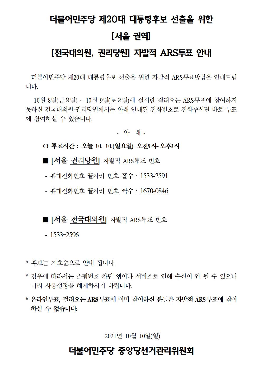 더불어민주당 제20대 대통령후보 선출을 위한 [서울 권역] 자발적 ARS투표 안내