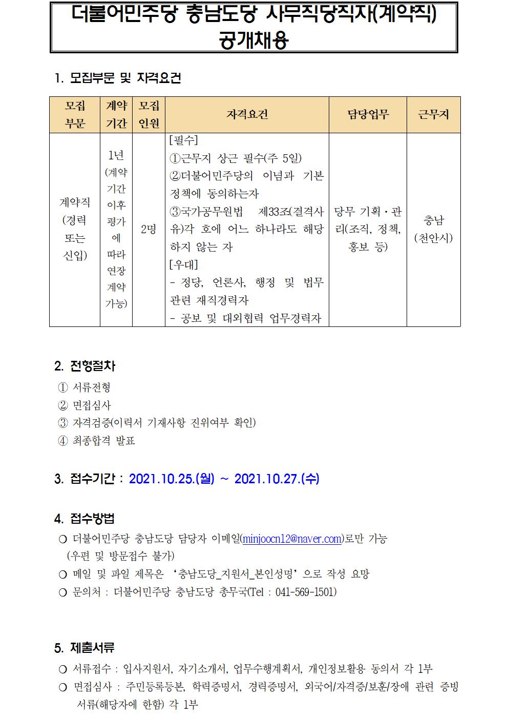 더불어민주당 충남도당 사무직당직자(계약직) 공개채용