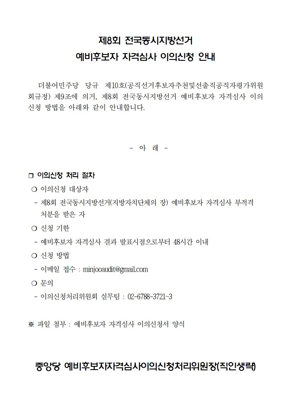제8회 전국동시지방선거 예비후보자 자격심사 이의신청 안내