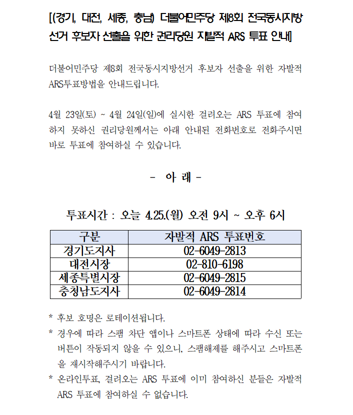 (경기, 대전, 세종, 충남) 더불어민주당 제8회 전국동시지방선거 후보자 선출을 위한 권리당원 자발적 ARS 투표 안내