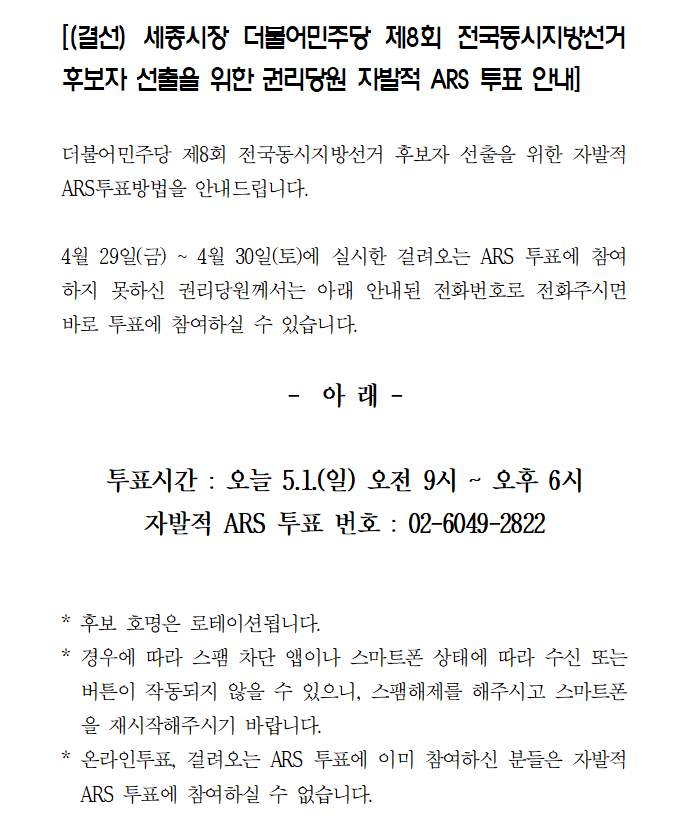 (결선)세종시장 더불어민주당 제8회 전국동시지방선거 후보자 선출을 위한 권리당원 자발적 ARS 투표 안내