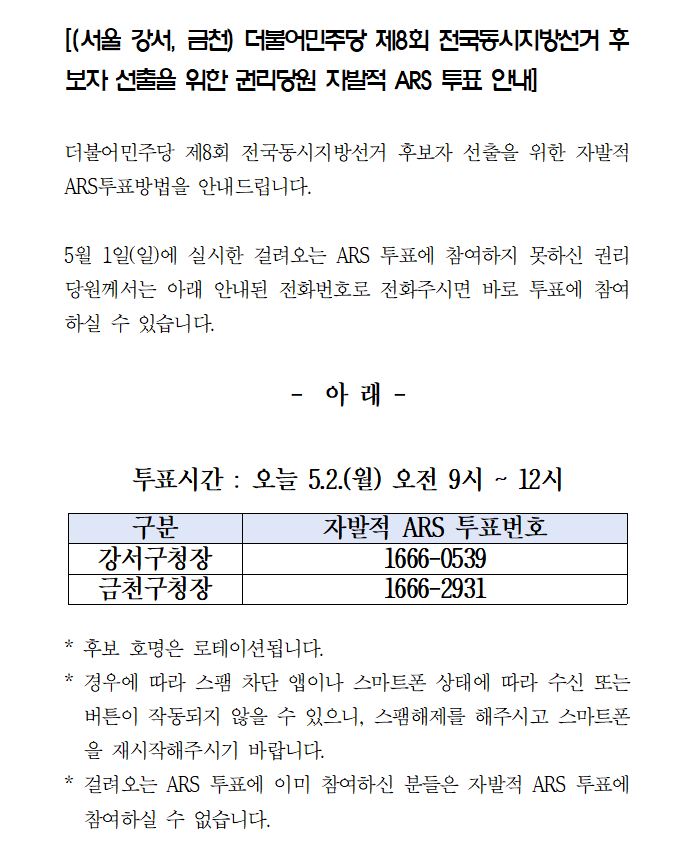 (서울 강서, 금천) 더불어민주당 제8회 전국동시지방선거 후보자 선출을 위한 권리당원 자발적 ARS 투표 안내