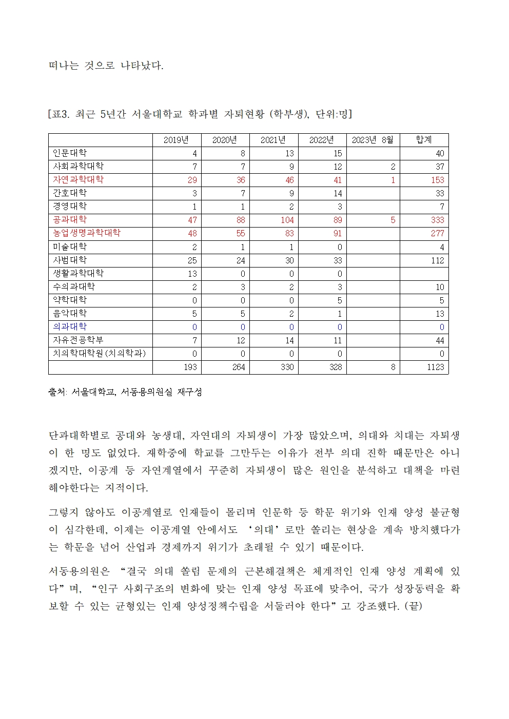 [서동용 의원] 심각한 의대 쏠림, 서울대 붙어도 안가고 다녀도 그만둔다