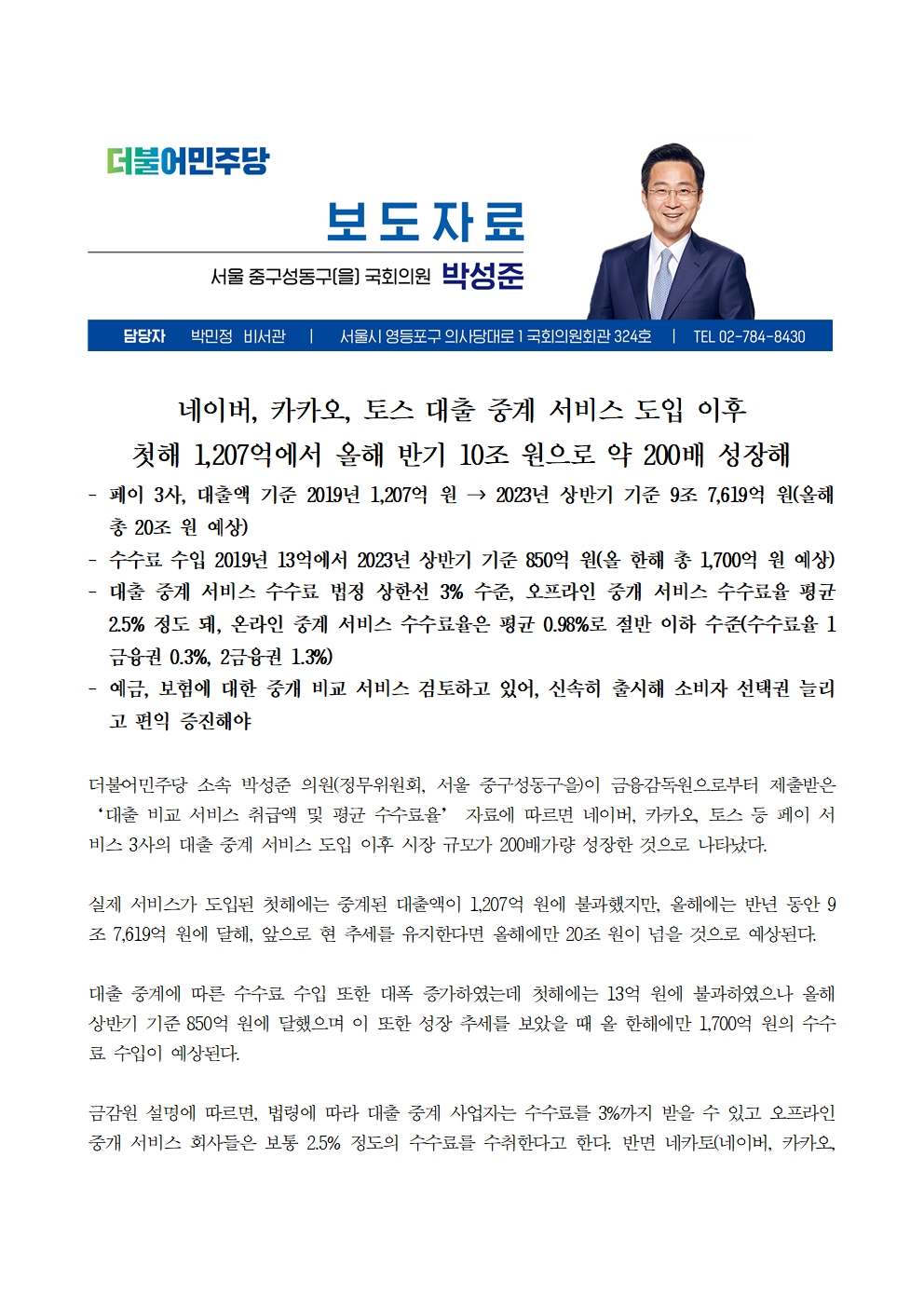 [국회의원 박성준_보도자료]네이버,카카오,토스 대출 중계 서비스 도입 이후 시장 규모 약 200배 성장해