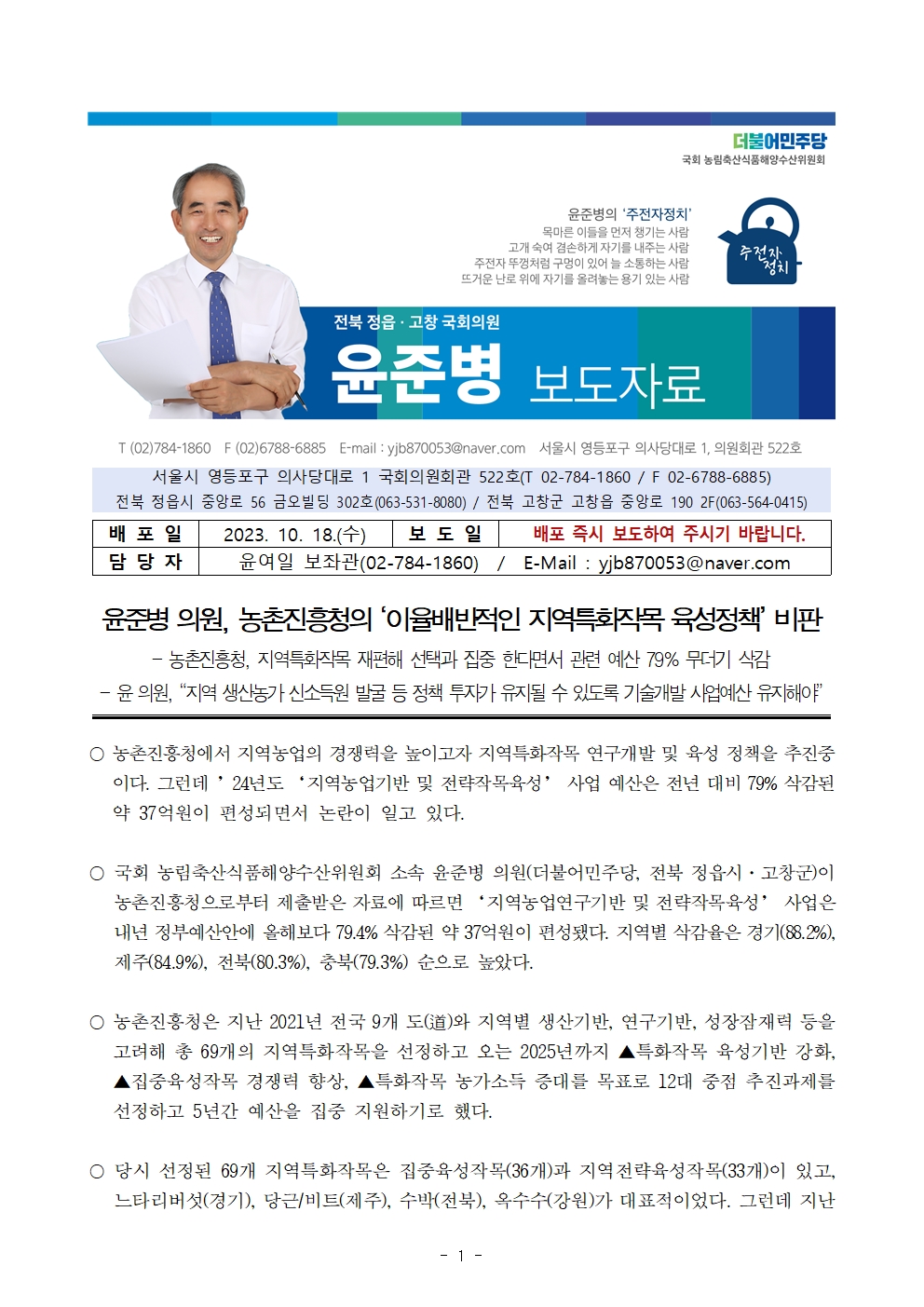 231018 [윤준병 의원 국정감사 보도자료] 윤준병 의원 농촌진흥청의 이율배반적인 지역특화작목 육성정책’ 비판.hwp