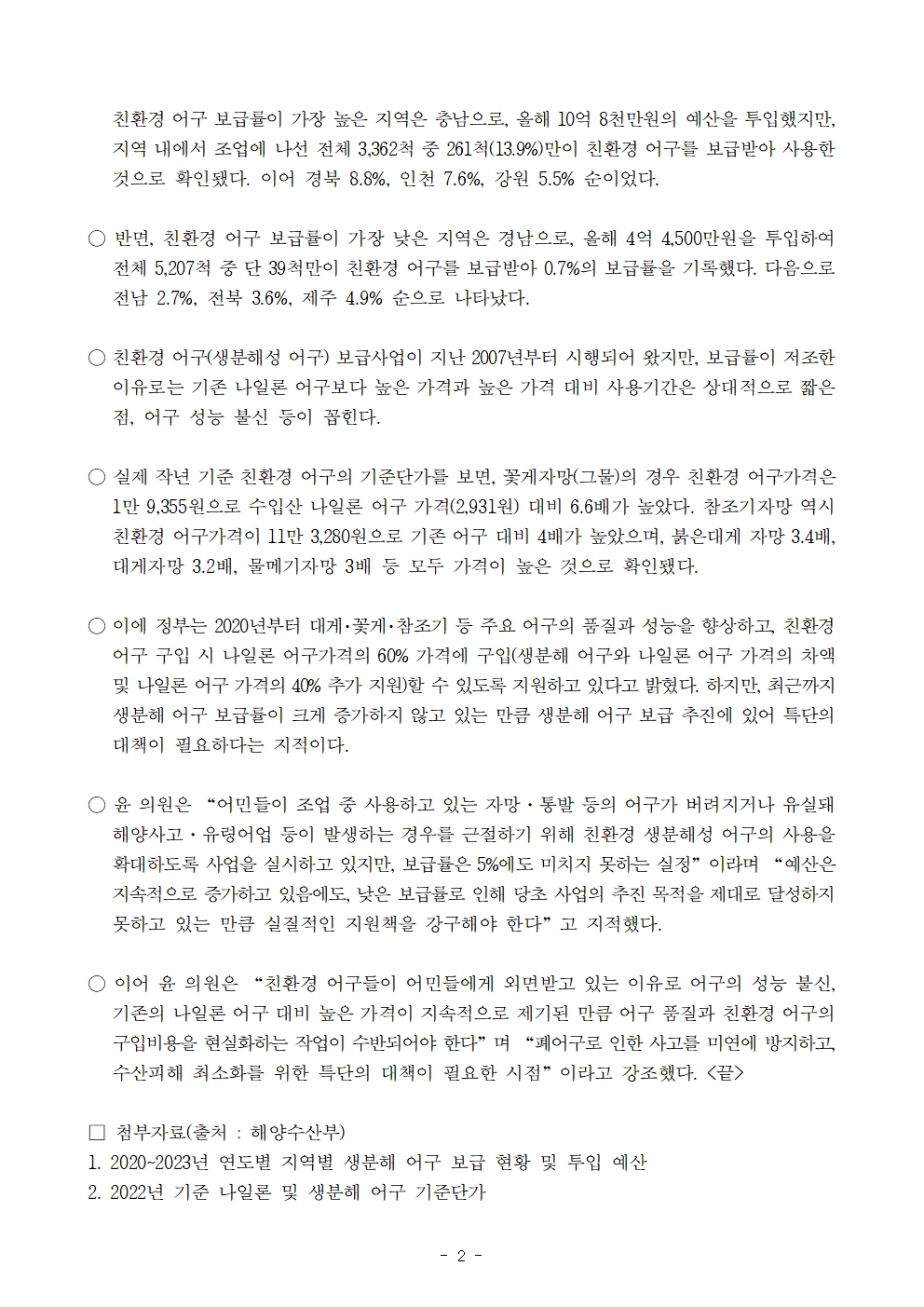231019 [윤준병 의원 국정감사 보도자료] 윤준병 의원 친환경어구 207억 투입해도 보급률 제자리.hwp