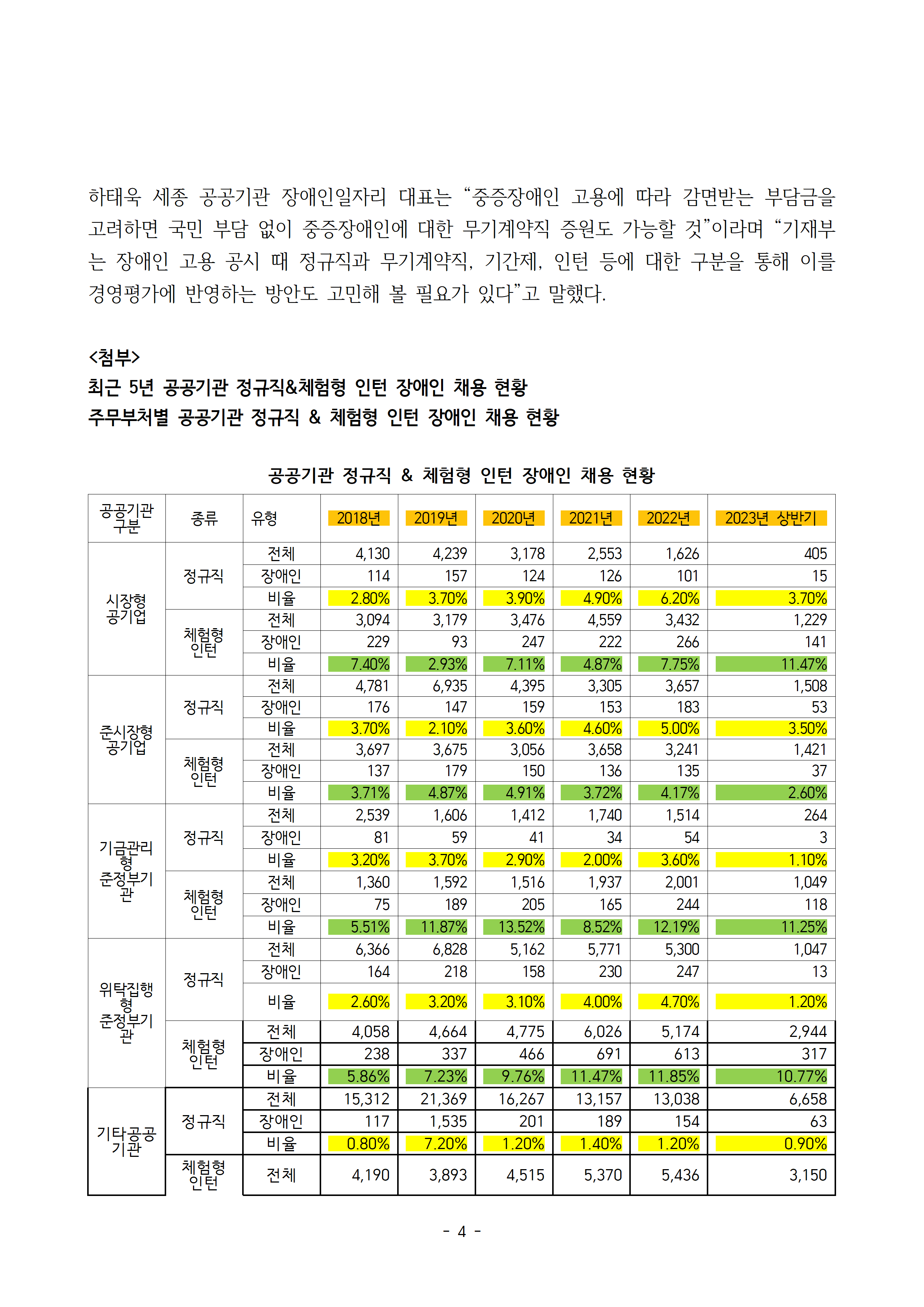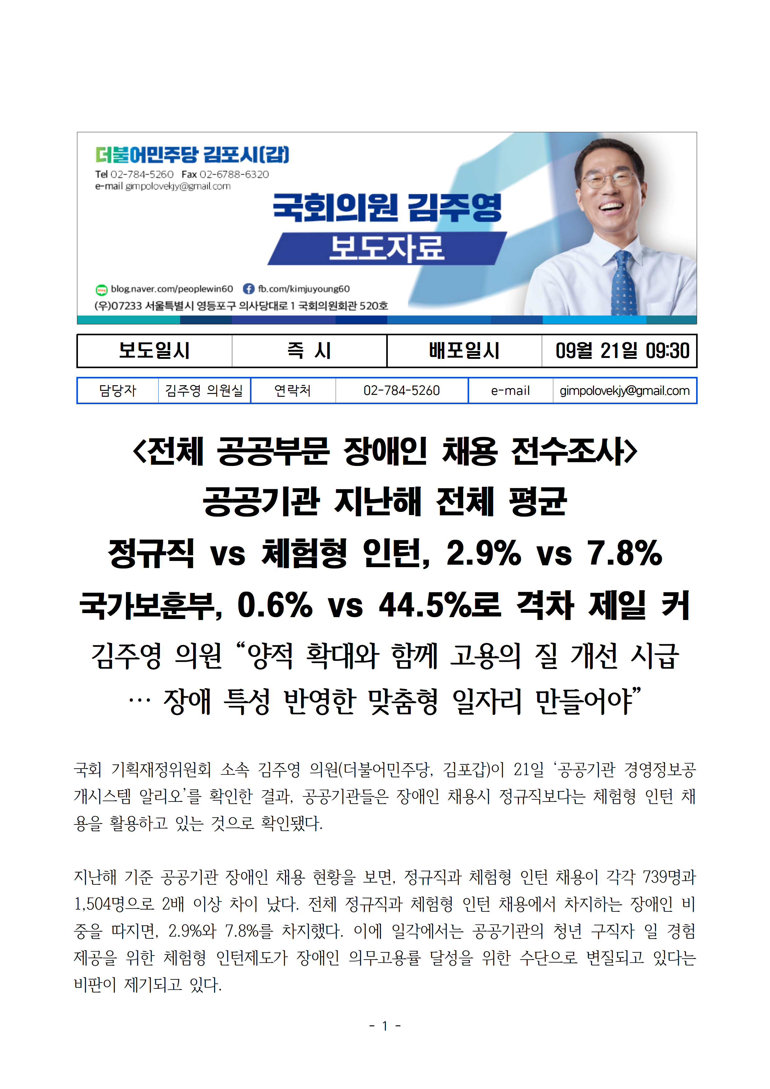 [김주영 의원 국감보도자료] <전체 공공부문 장애인 채용 전수조사> 공공기관 지난해 전체 평균 정규직 vs 체험형 인턴, 2.9% vs 7.8% 국가보훈부 격차 제일커