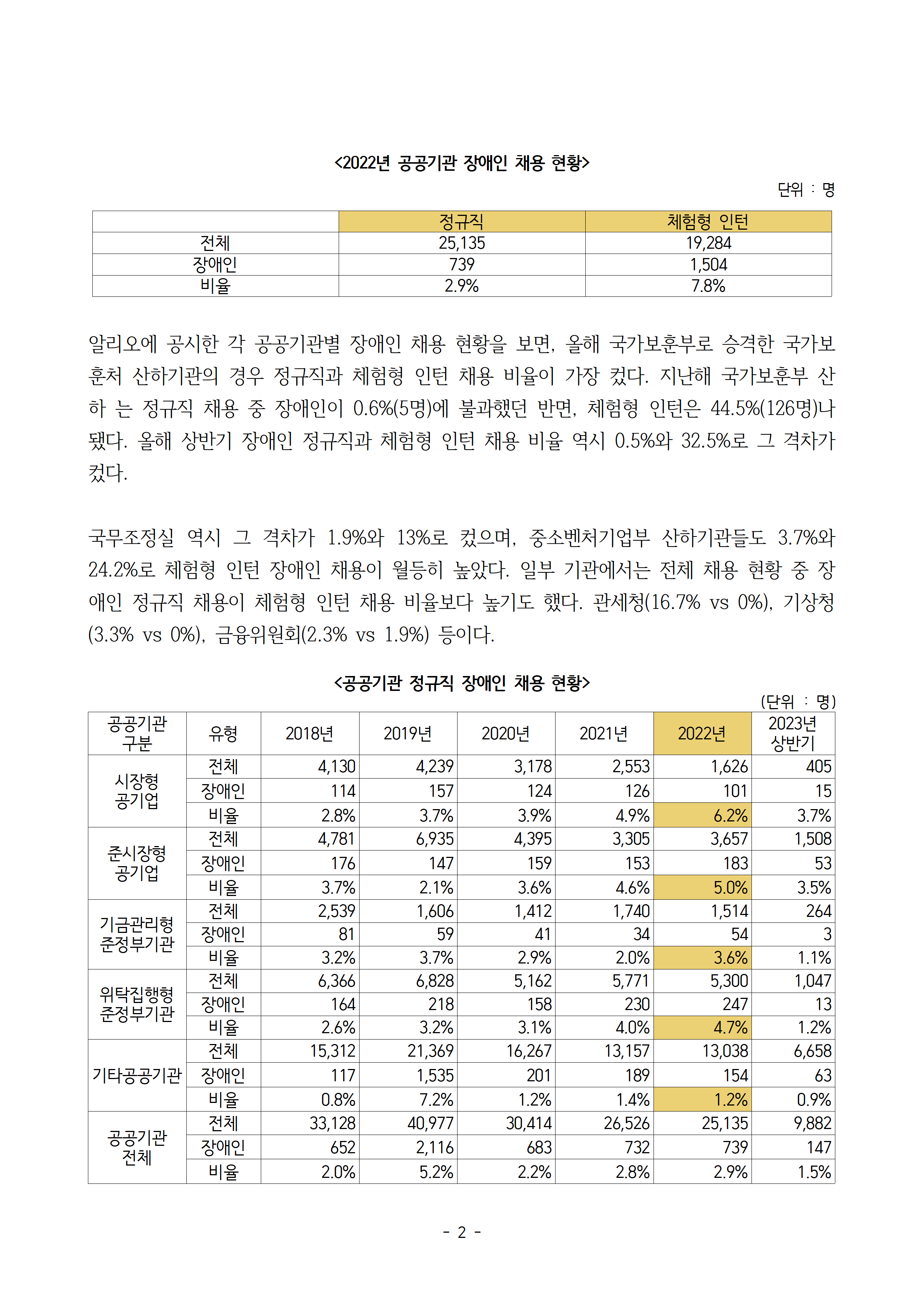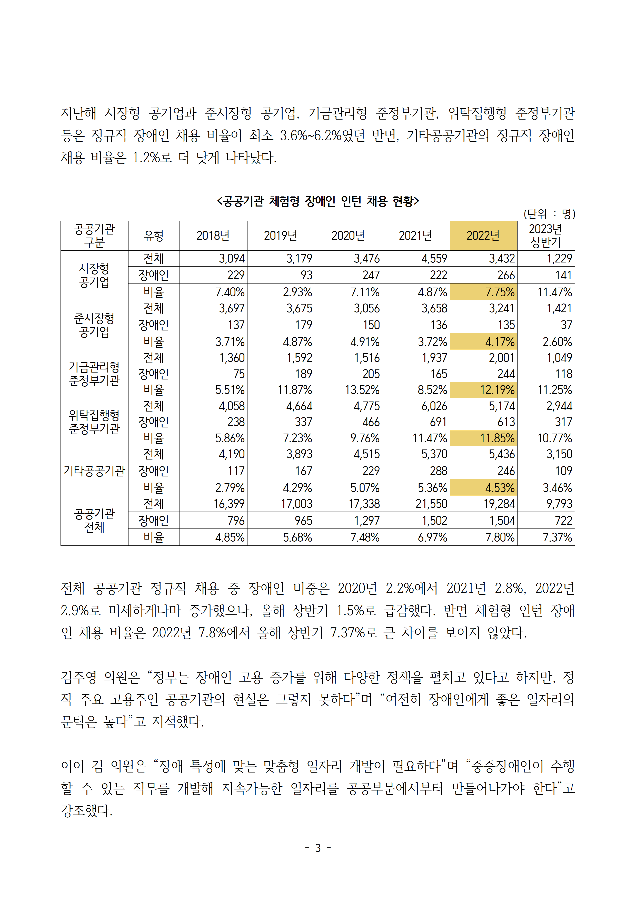 230921_국감보도자료_김주영_의원_공공부문 장애인 채용 전수조사_지난해 정규직 vs 체험형 인턴_2.9% vs 7.8%.hwp