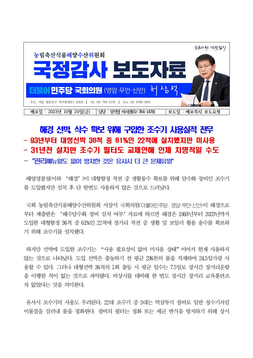 [서삼석 국회의원]231020_서삼석,"해경 선박, 식수 확보 위해 구입한 조수기 사용실적 전무"
