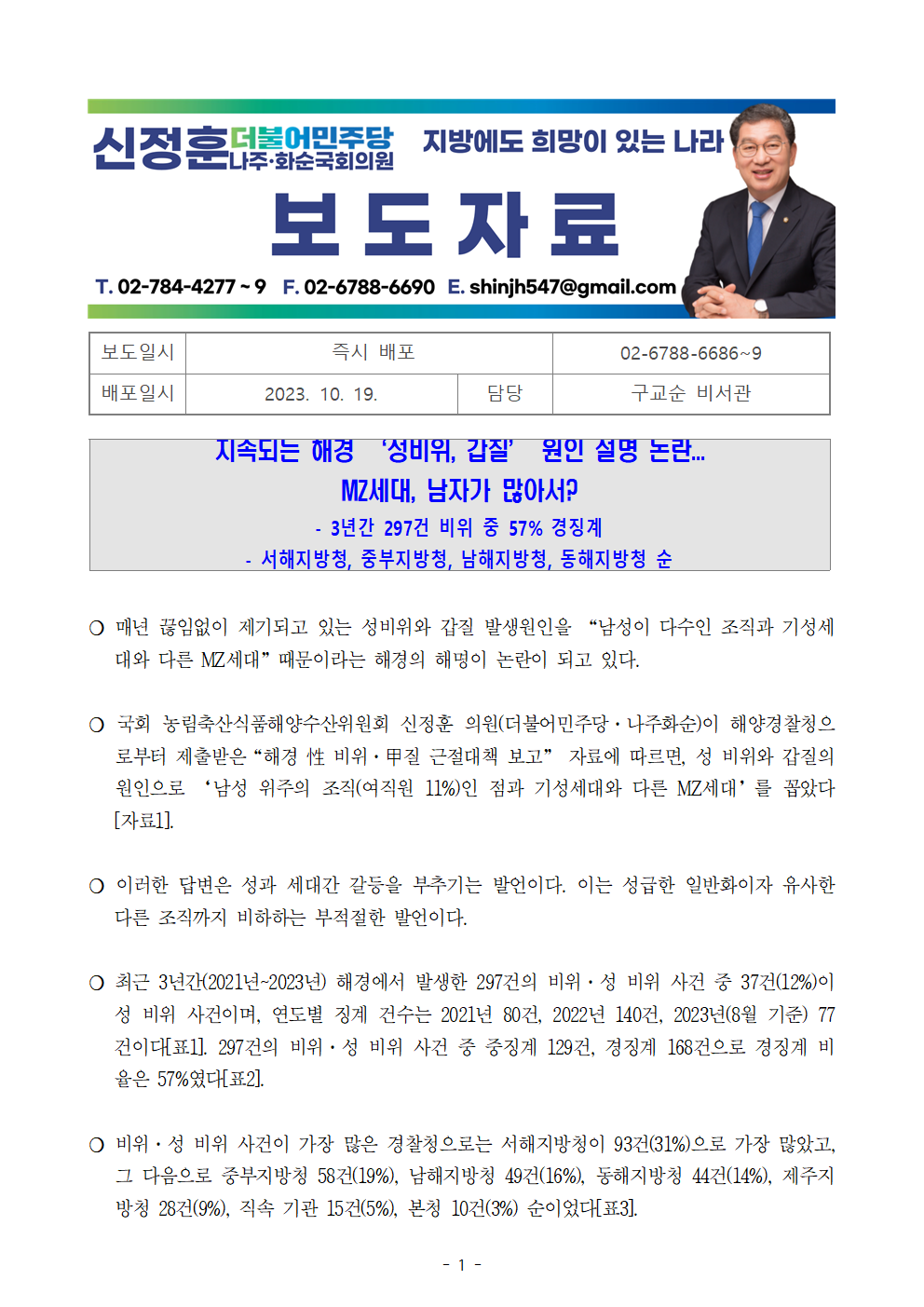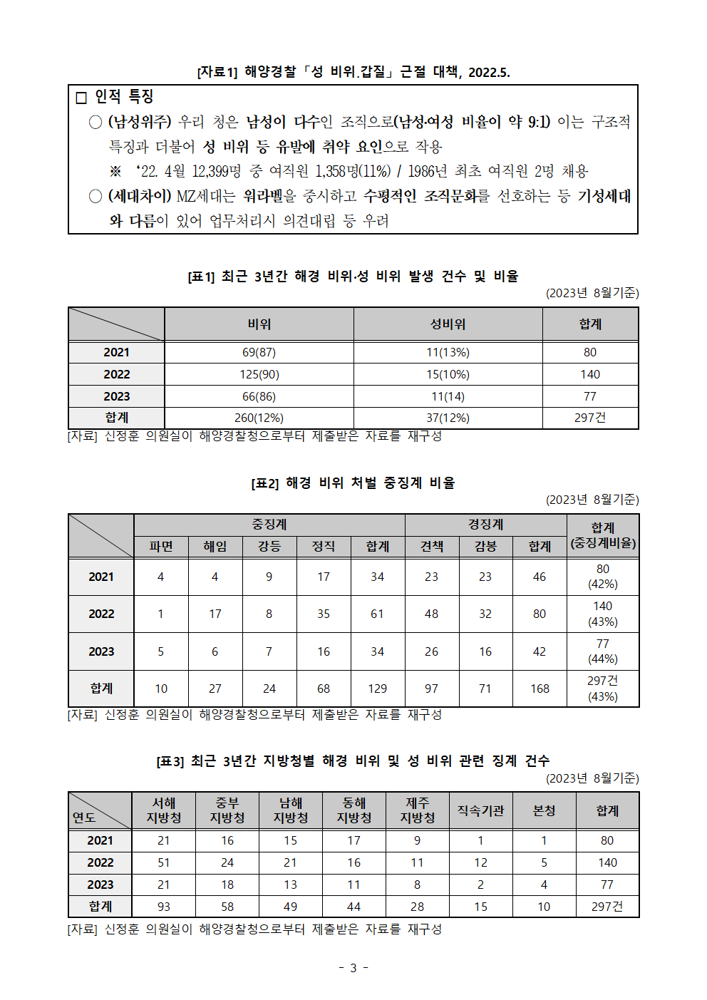 [신정훈 의원 보도자료] 지속되는 해경 ‘성비위, 갑질’ 원인 설명 논란... MZ세대, 남자가 많아서?