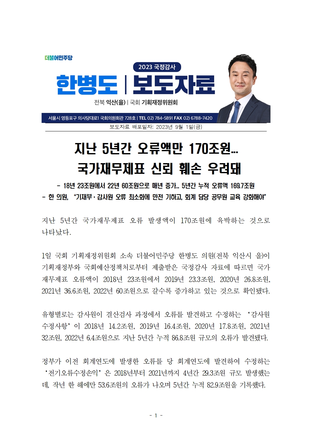 [한병도의원]2023기재위국정감사보도자료(1)_지난 5년간 오류액만 170조원 국가재무제표 신뢰 훼손 우려돼.hwp
