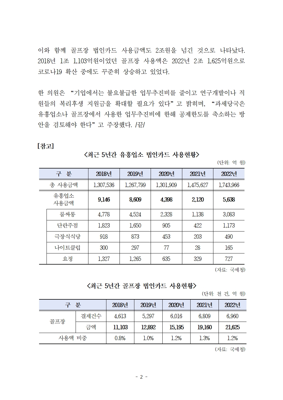 [한병도의원]2023기재위국정감사보도자료(7)_유흥업소 법인카드 결제액 코로나 팬데믹 끝나자 1년새 2.5배 급증.hwp