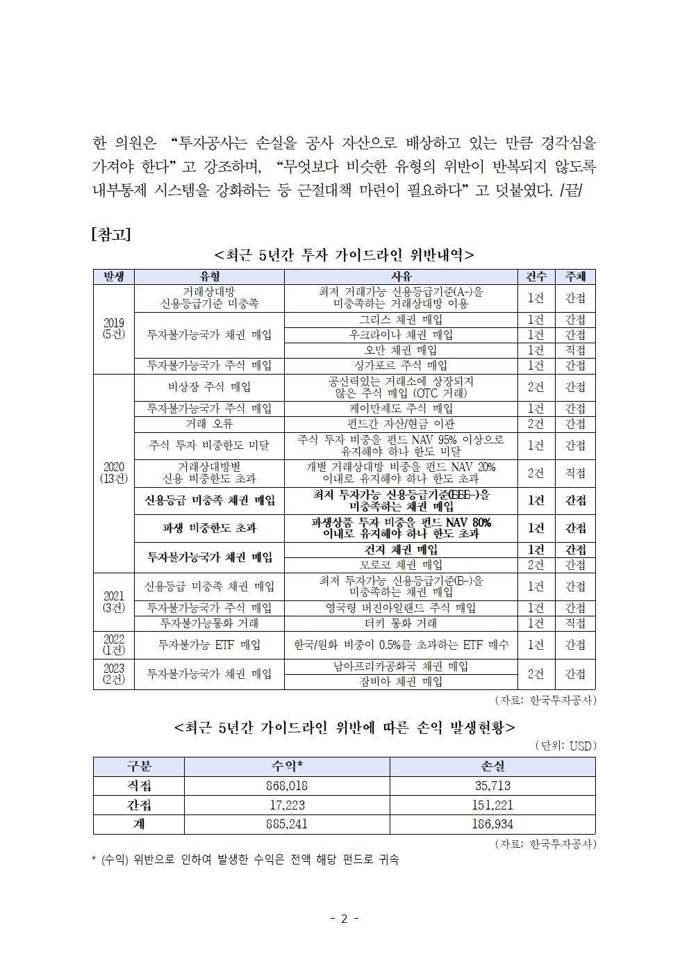 [한병도의원]2023기재위국정감사보도자료(15)_국부펀드 한국투자공사 최근 5년간 투자 가이드라인 위반 사례 24건 달해.hwp