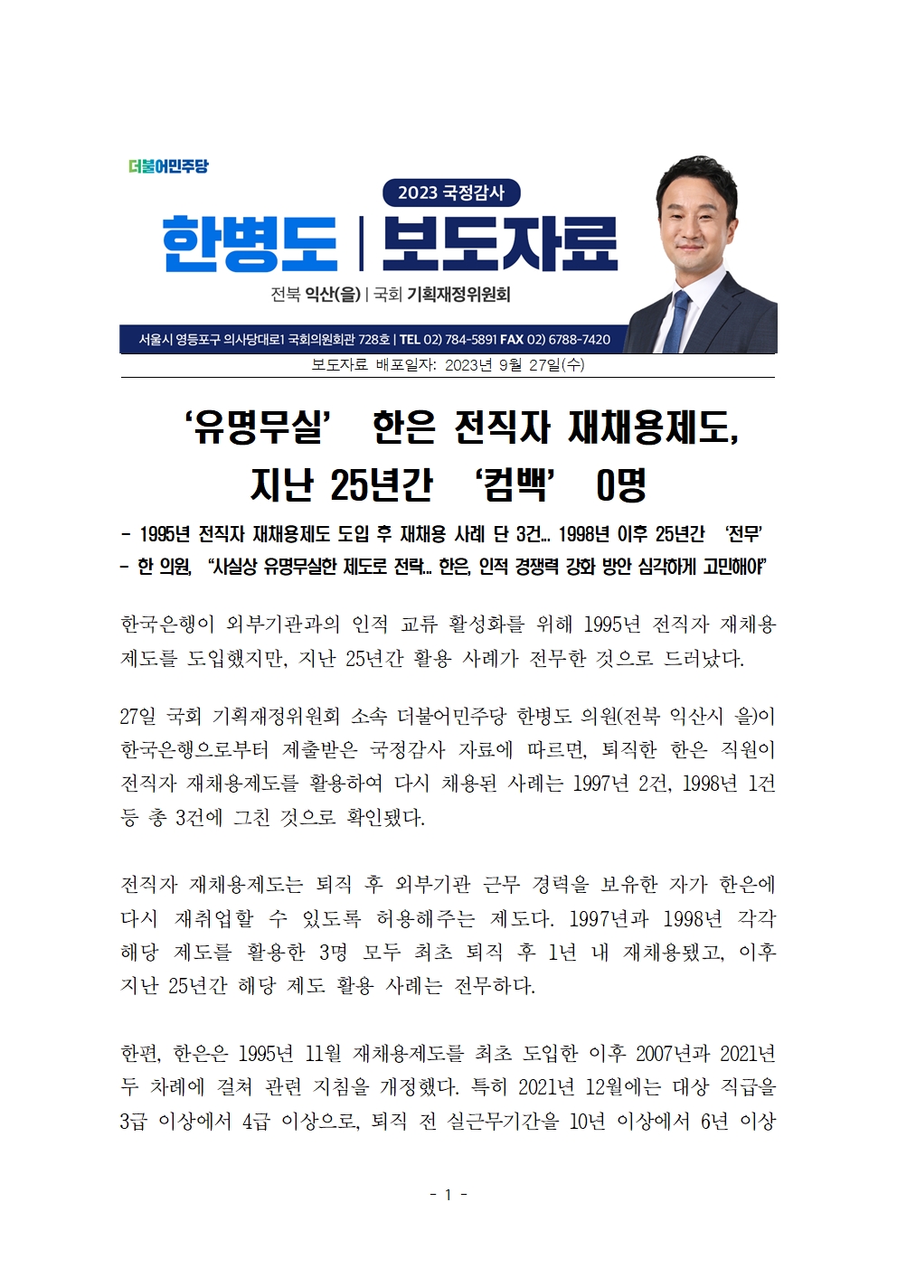 [국회의원 한병도 국감 보도자료] ‘유명무실’ 한은 전직자 재채용제도_ 지난 25년간 ‘컴백’ 0명