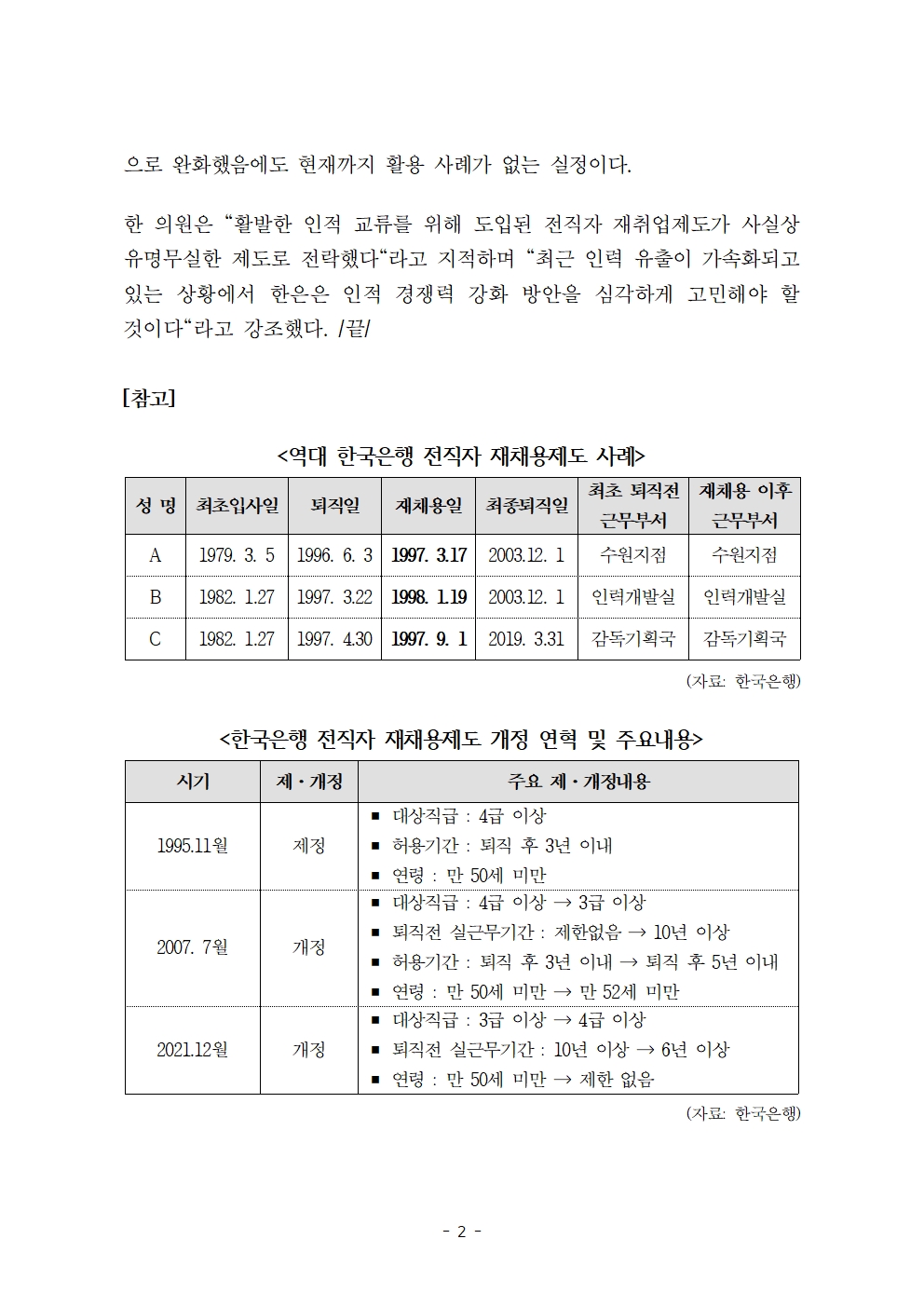 [한병도의원]2023기재위국정감사보도자료(20)_‘유명무실’ 한은 전직자 재채용제도 지난 25년간 ‘컴백’ 0명.hwp