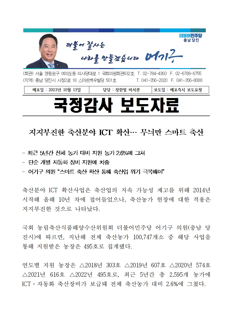 231013 [어기구의원 국정감사 보도자료] 지지부진한 축산분야 ICT 확산… 무늬만 스마트 축산 .hwp