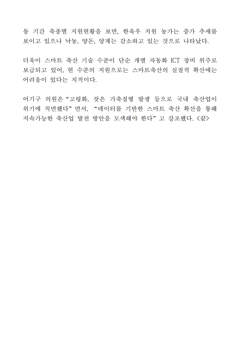 [어기구의원 국정감사 보도자료] 지지부진한 축산분야 ICT 확산… 무늬만 스마트 축산
