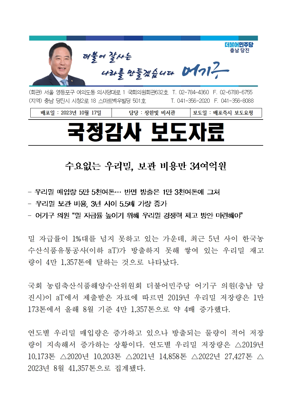 231017 [어기구의원 국정감사 보도자료] 수요없는 우리밀 보관 비용만 34여억원 .hwp
