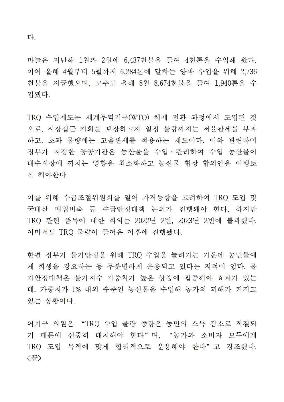 [어기구의원 국정감사 보도자료] 무분별한 TRQ 운용…농민 위기로 내몰려