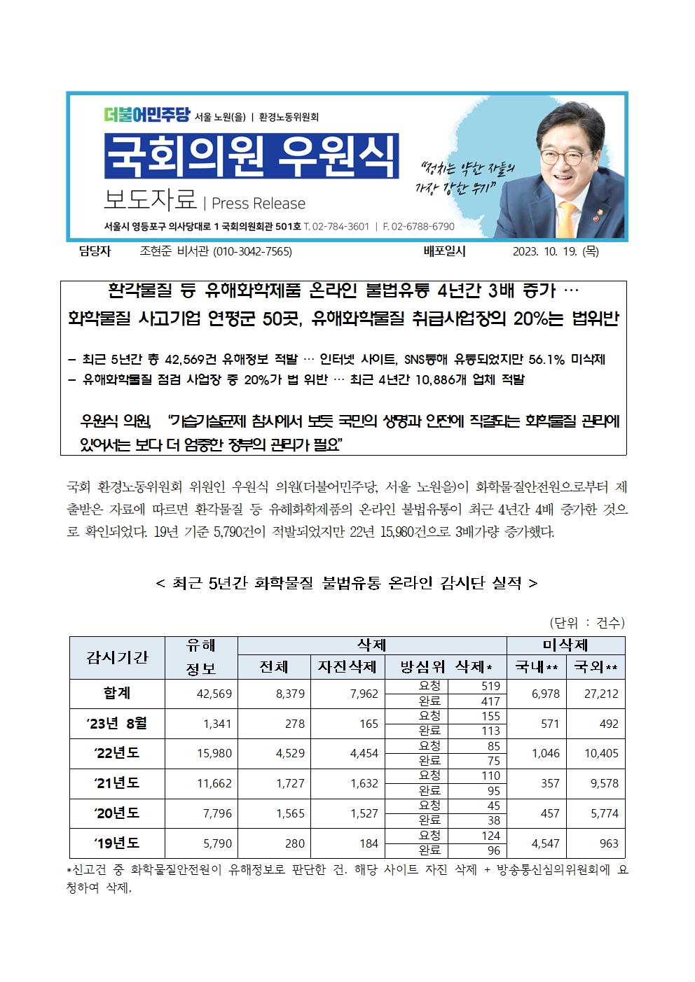 [우원식 의원 보도자료] 환각물질 등 유해화학제품 온라인 불법유통 4년간 3배 증가
