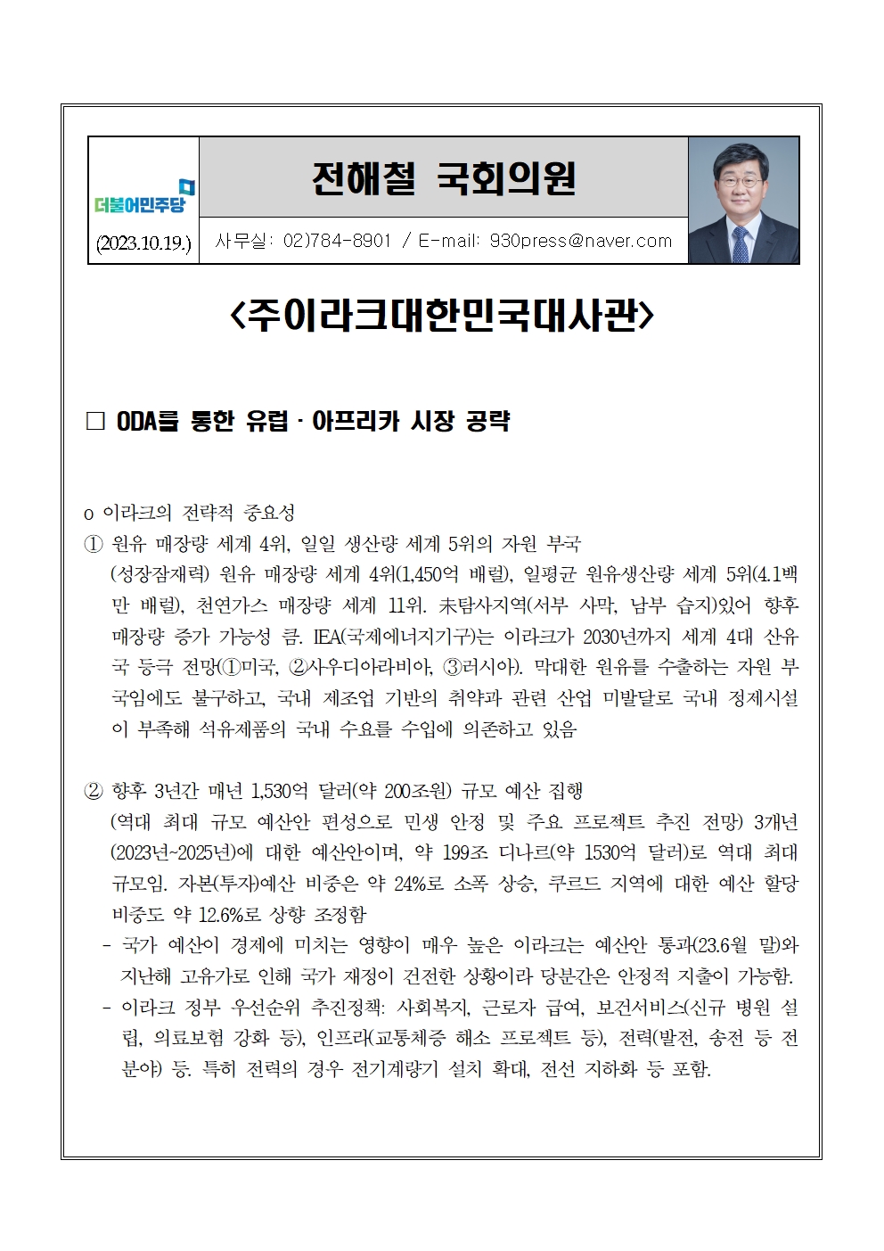 [전해철의원 국정감사 보도자료] 이라크 재건 시장 참여 안정성 강화를 위한 방안 마련 필요