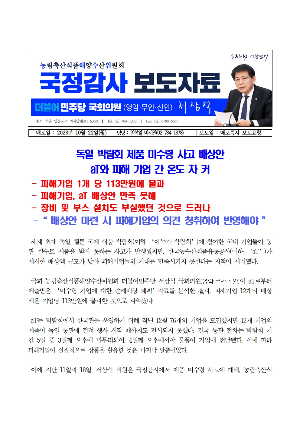 231023_[서삼석 국회의원] aT 피해 기업에 대한 보상은 113만원 수준 4안.hwp