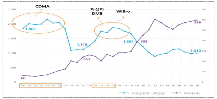 단편적으로 한국전자통신연구원(ETRI)를 보면, 90년대까지 D-RAM, TDX, CDMA 등 대형 국책사업에서 큰 성과를 내면서 국가경제발전에 크게 이바지했으나, 현재는 과거와 같은 혁신적인 성과가 부족하다는 평가를 받고 있다.