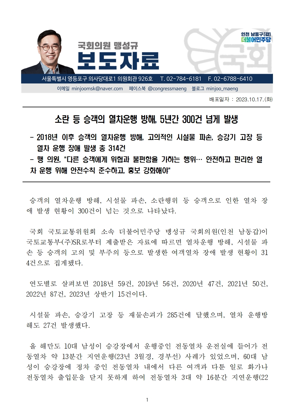 [맹성규의원 보도자료] 소란 등 승객의 열차운행 방해, 5년간 300건 넘게 발생