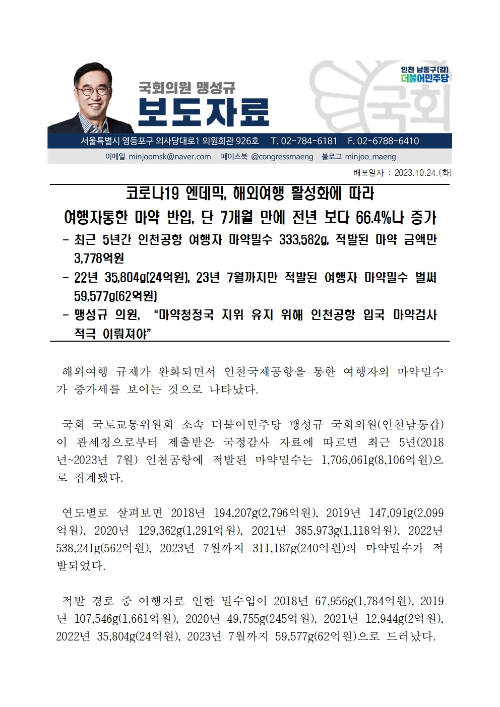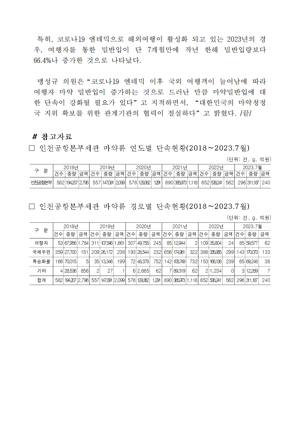 [맹성규의원 보도자료] 코로나19 엔데믹, 해외여행 활성화에 따라 여행자통한 마약 반입, 단 7개월 만에 전년 보다 66.4%나 증가