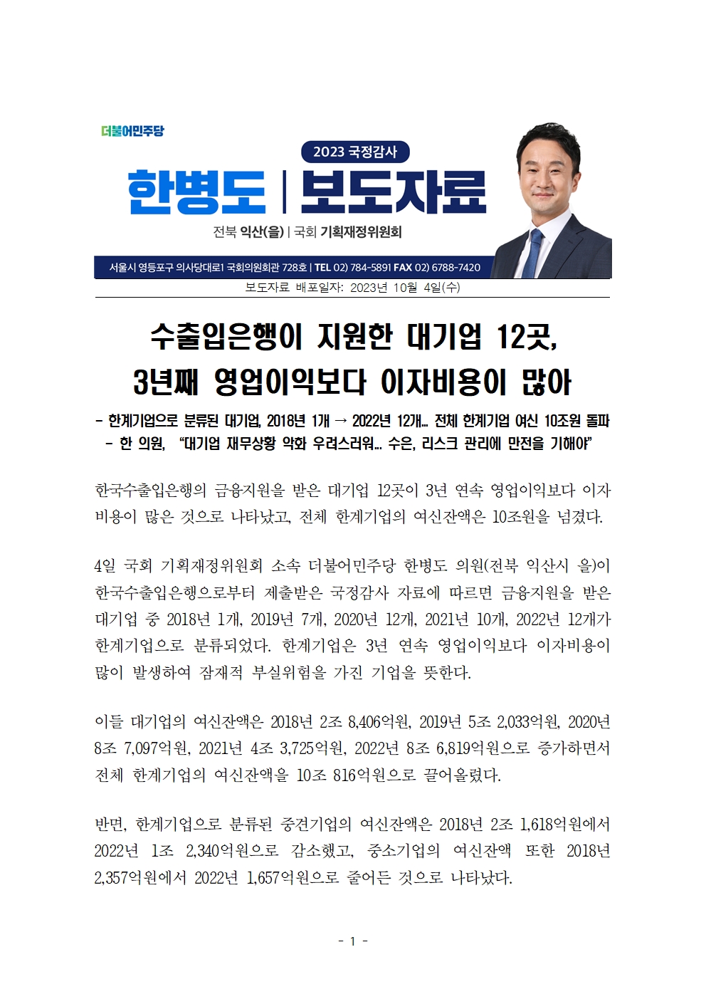 [국회의원 한병도 국감 보도자료] 수출입은행이 지원한 대기업 12곳, 3년째 영업이익보다 이자비용이 많아
