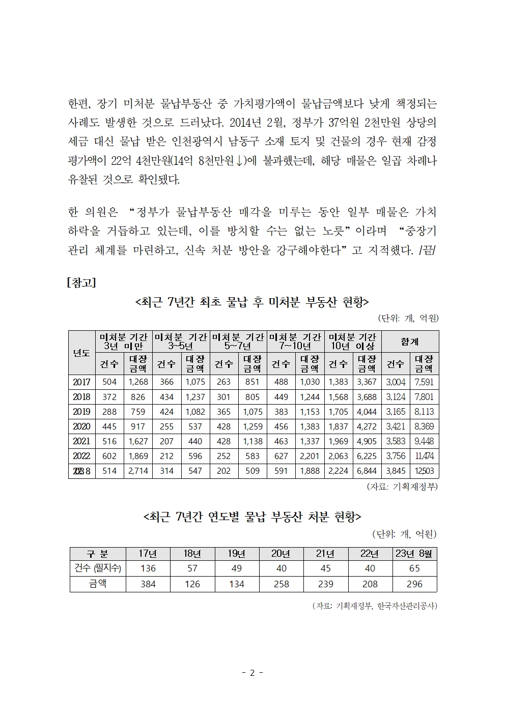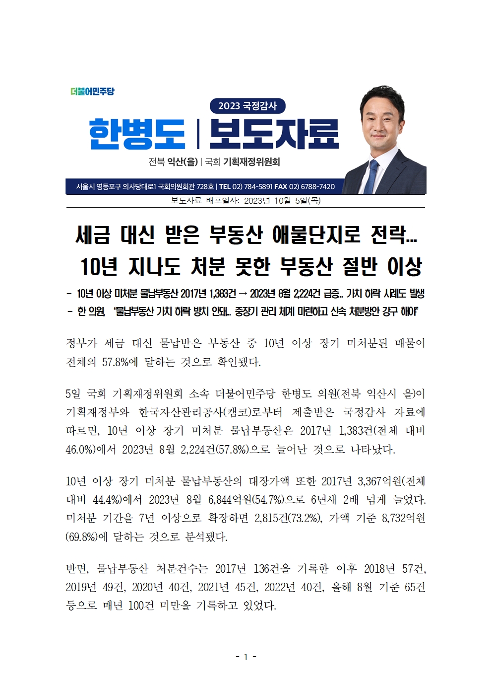 [한병도의원]2023기재위국정감사보도자료(24)_세금 대신 받은 부동산 애물단지로 전락... 10년 지나도 처분 못한 부동산 절반 이상.hwp