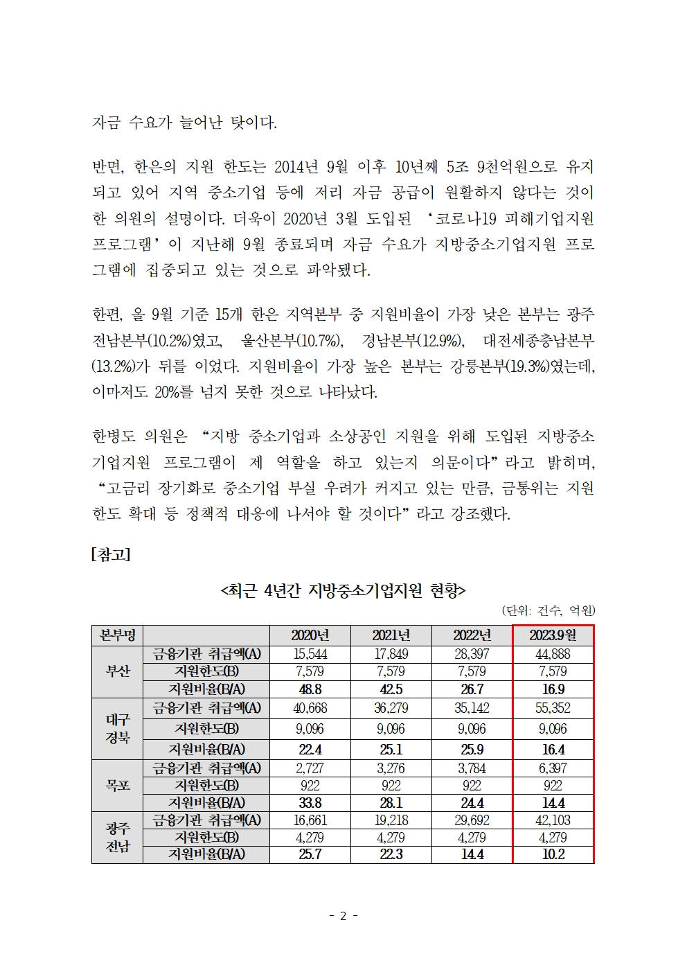 [한병도의원]2023기재위국정감사보도자료(30)_지방중소기업 저리 대출 수요 급증하는데... 한은 지원 한도는 10년째 ‘제자리’.hwp
