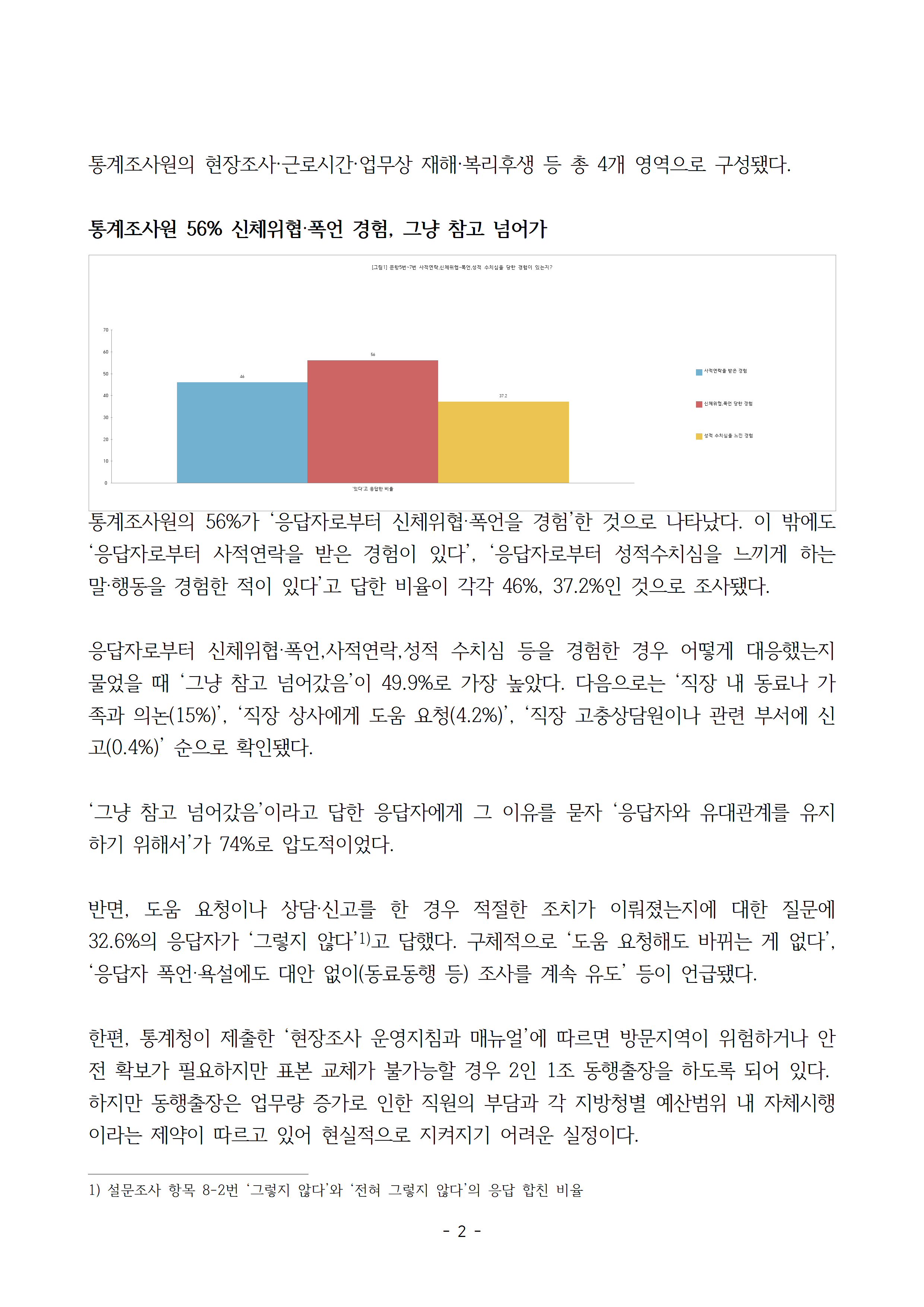 [김주영 의원 국감보도자료] <통계조사원 근로실태 설문조사 실시> 통계조사원 56%“신체위협‧폭언 경험” 그냥 참고 넘어가는 이유 묻자 ‘응답자 유대관계 유지 위해’74%응답
