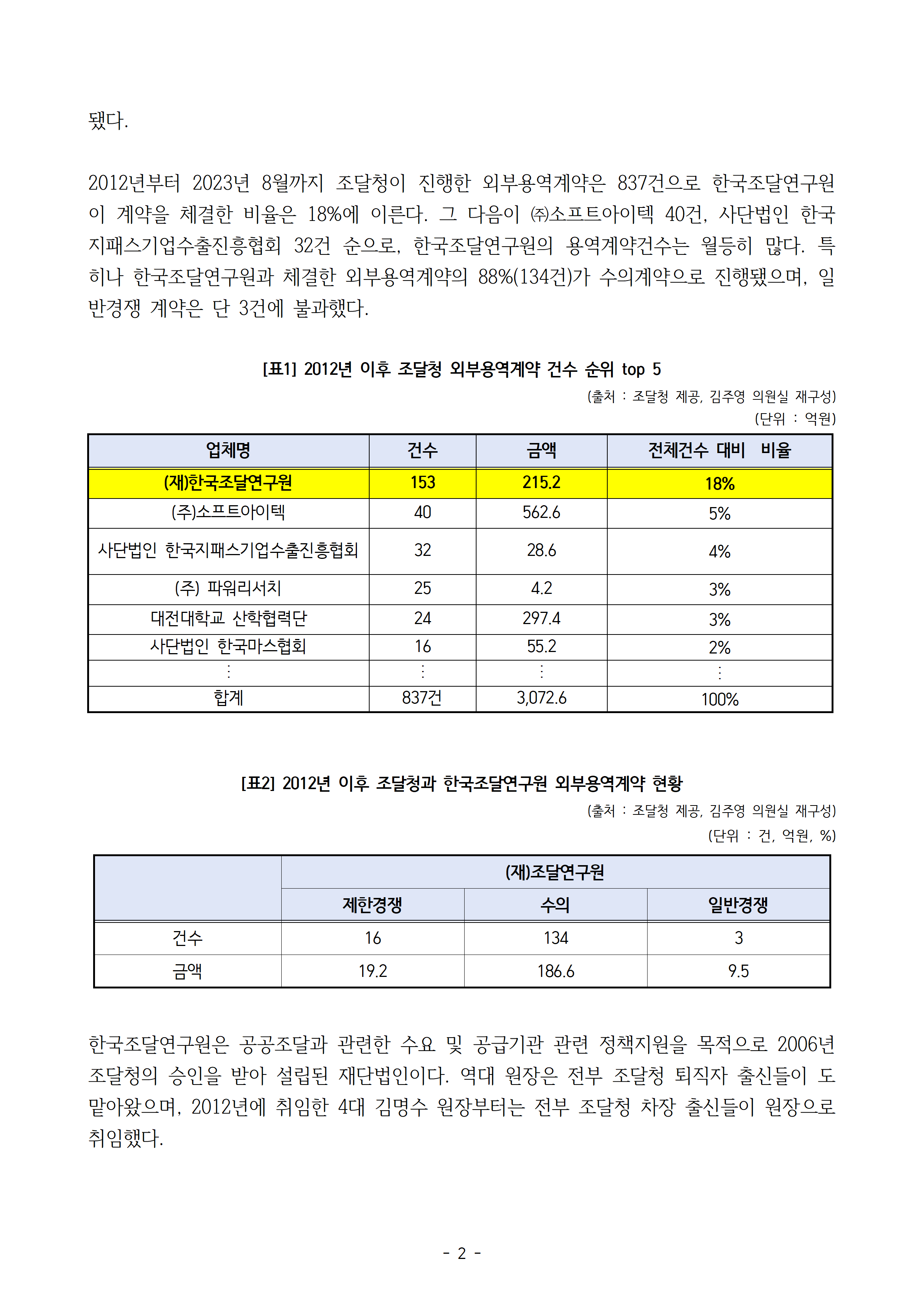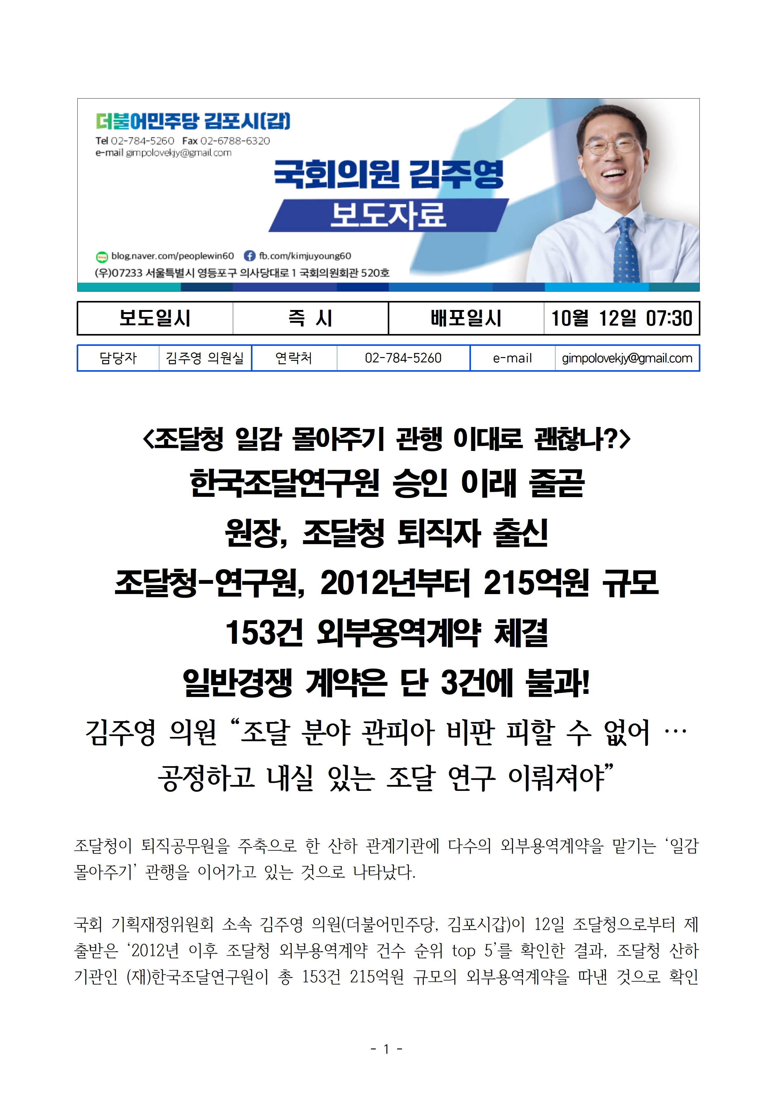 [김주영 의원 국감보도자료]한국조달연구원 승인 이래 줄곧 원장,조달청 퇴직자 출신 조달청-연구원, 2012년부터 215억원 규모 153건 외부용역계약 체결 일반경쟁 계약 단3건