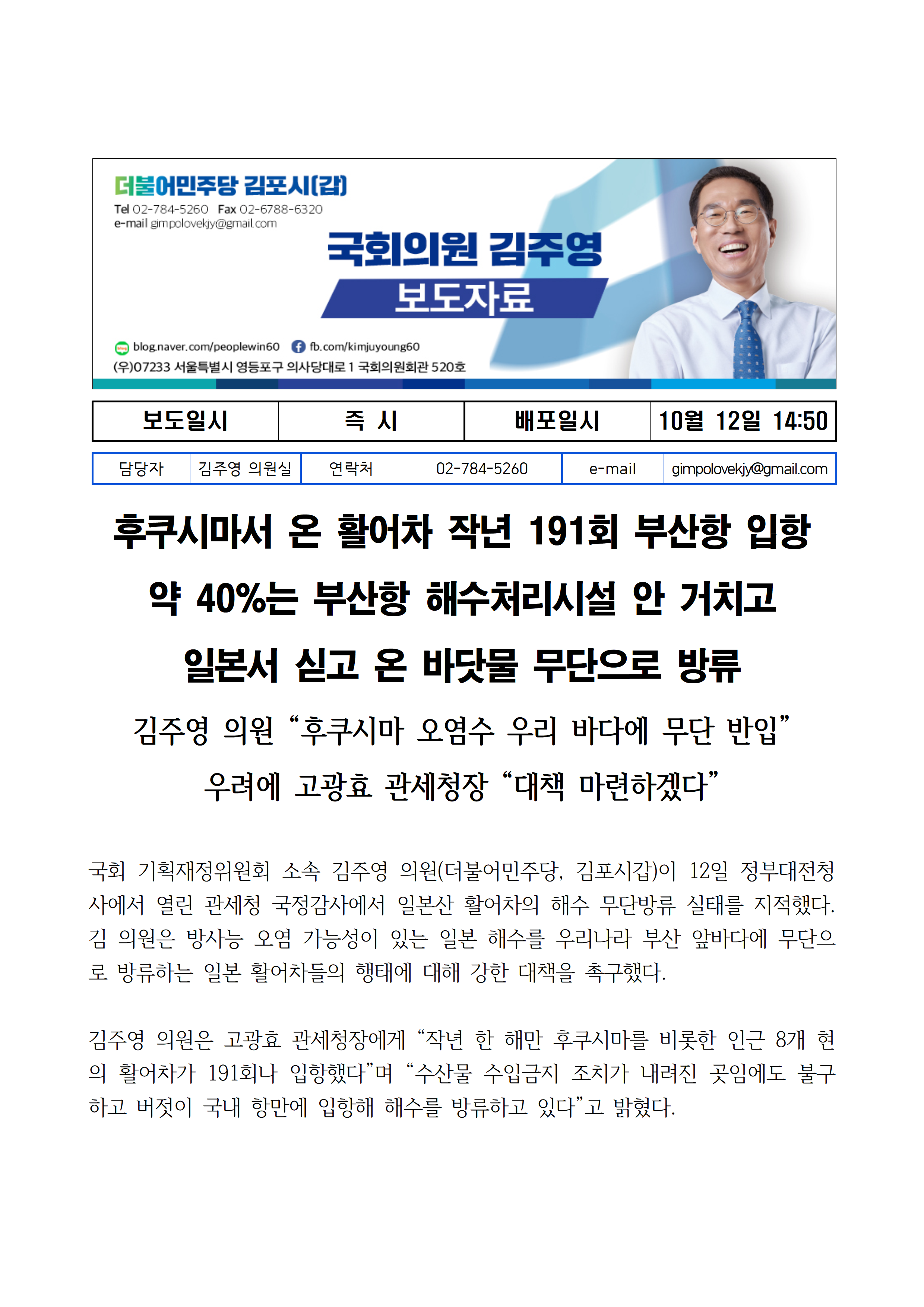 231012_국감보도자료_김주영_의원_후쿠시마서_온_활어차_우리바다에_무방비로_일본해수_방류한다_질의.hwp