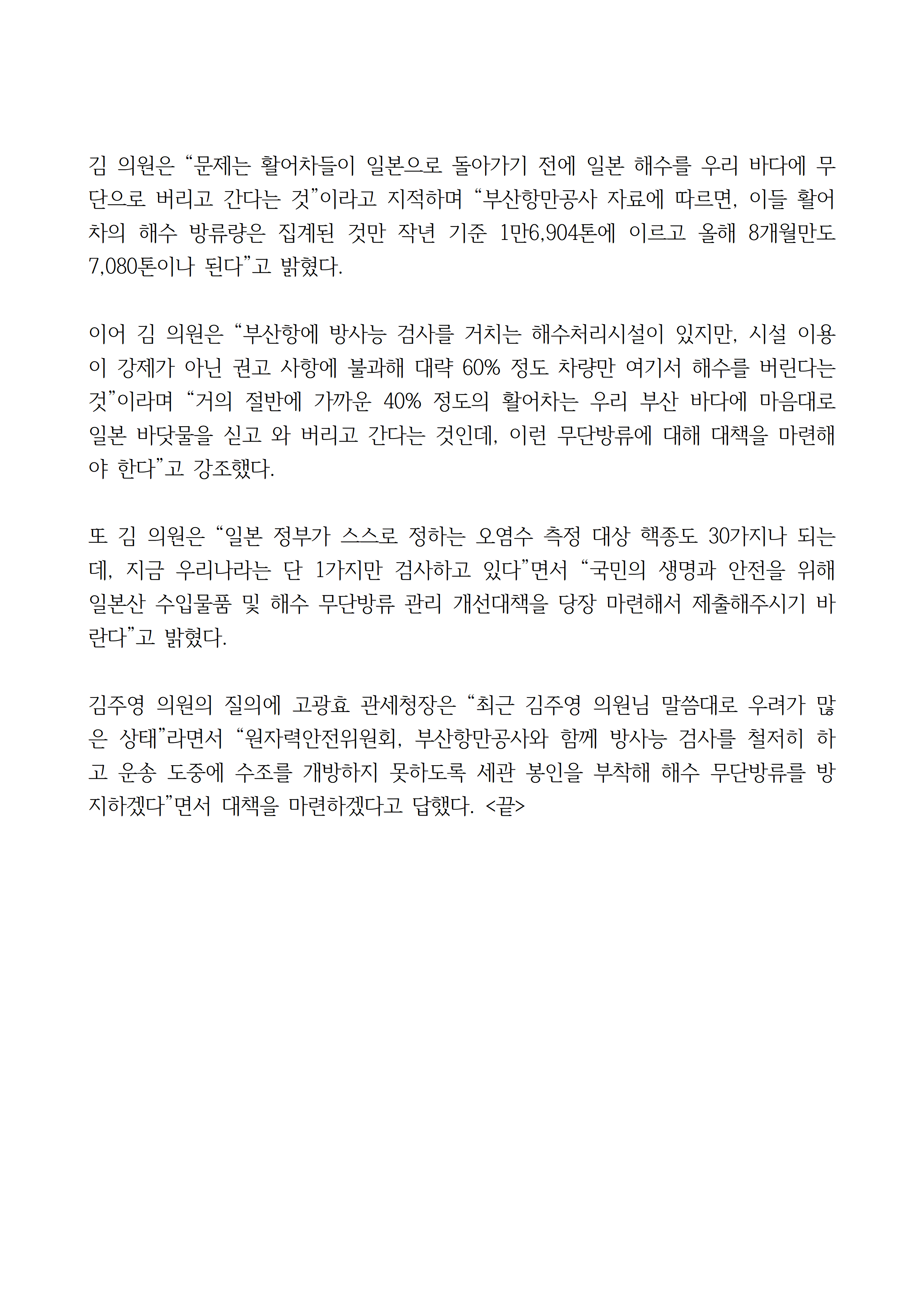[김주영 의원 국감보도자료] 후쿠시마서 온 활어차 작년 191회 부산항 입항 약 40%는 부산항 해수처리시설 안 거치고 일본서 싣고 온 바닷물 무단으로 방류