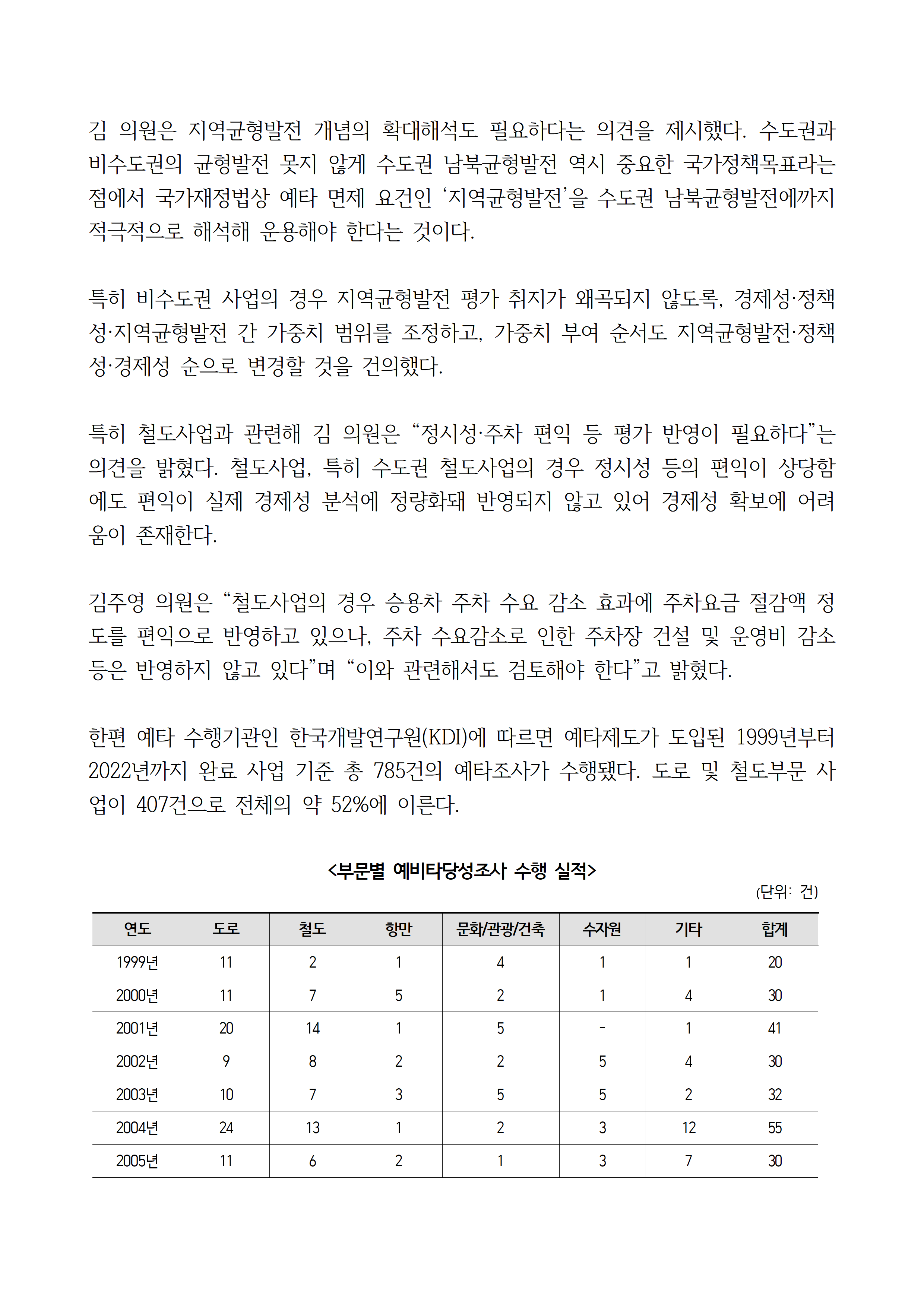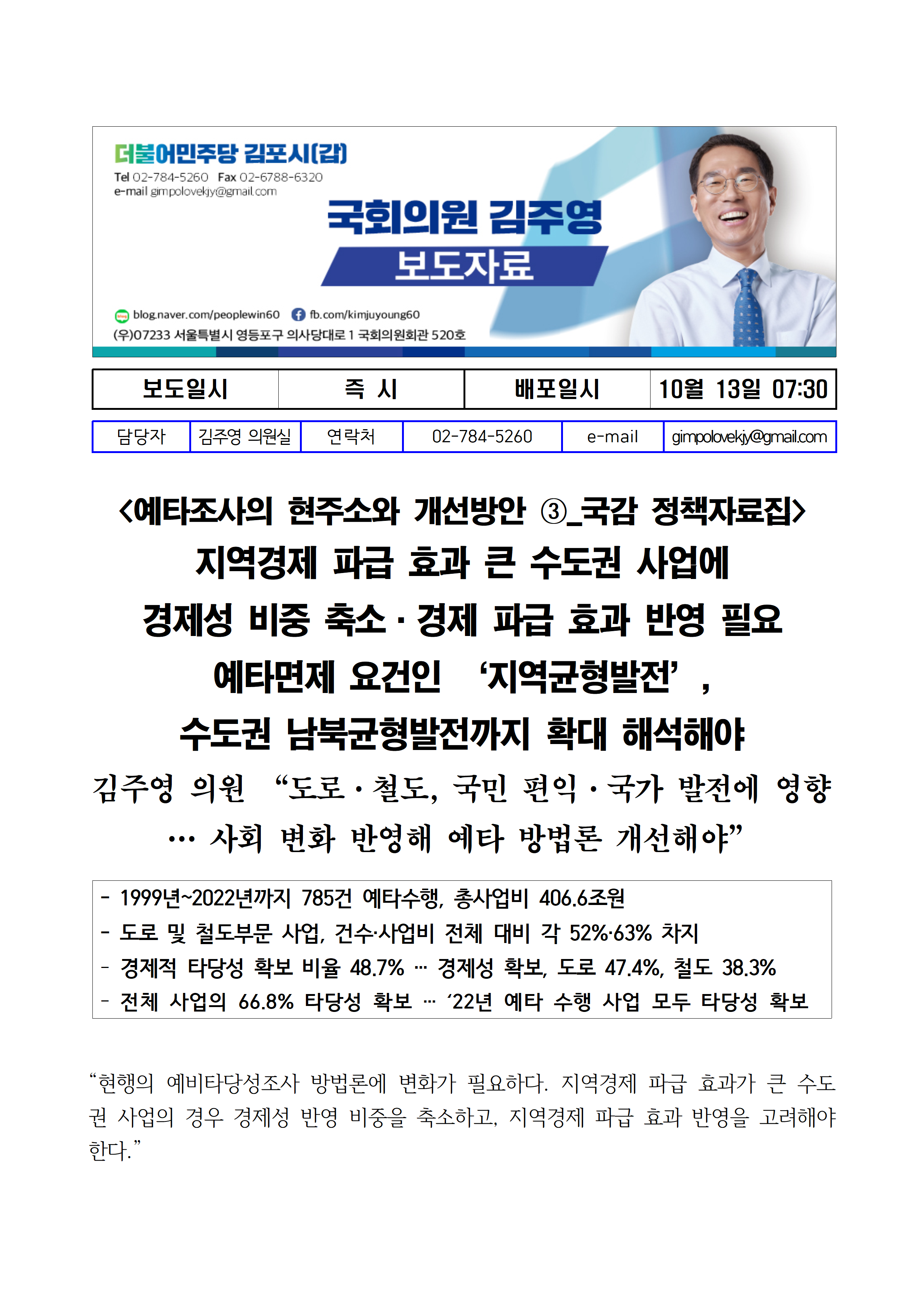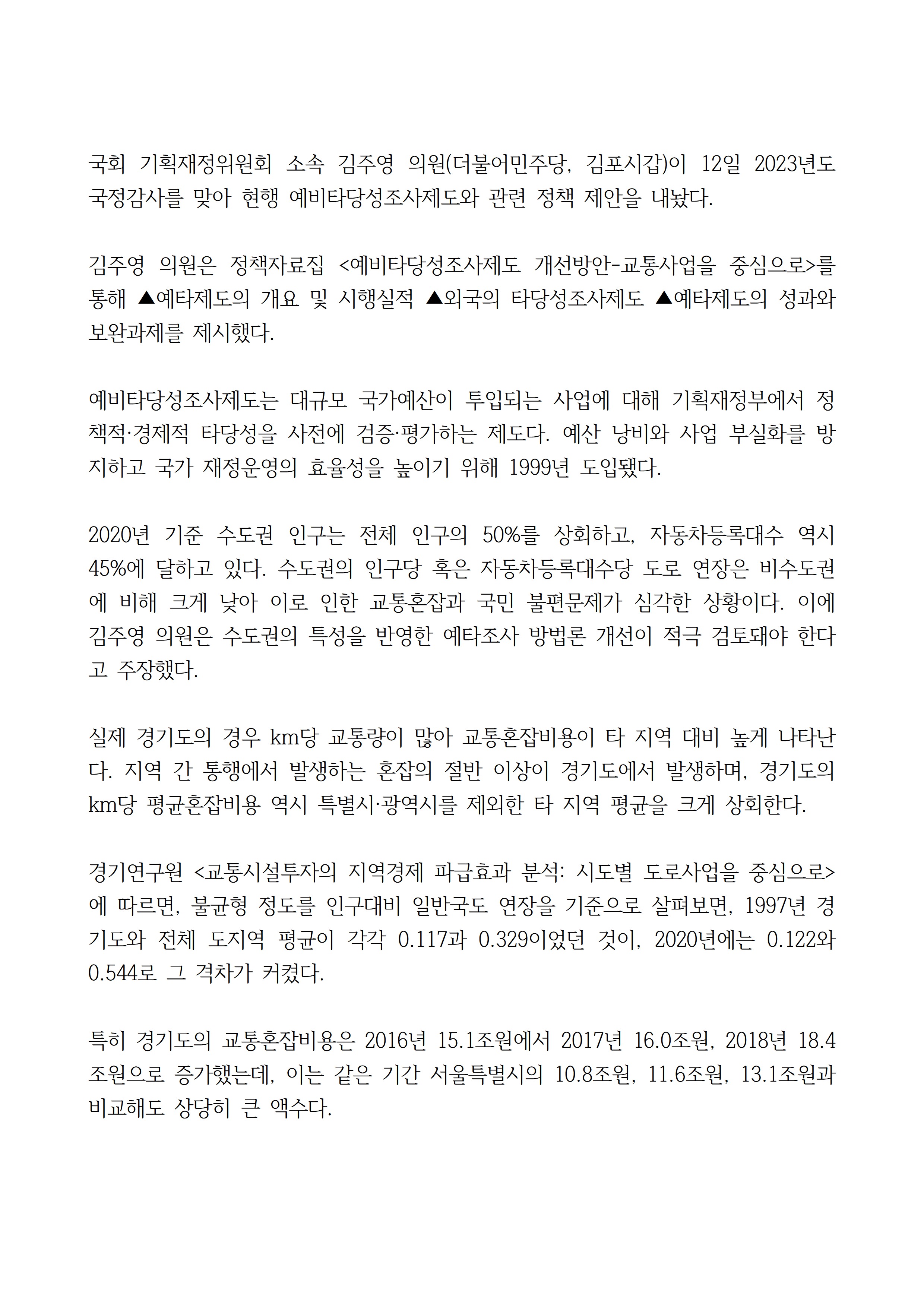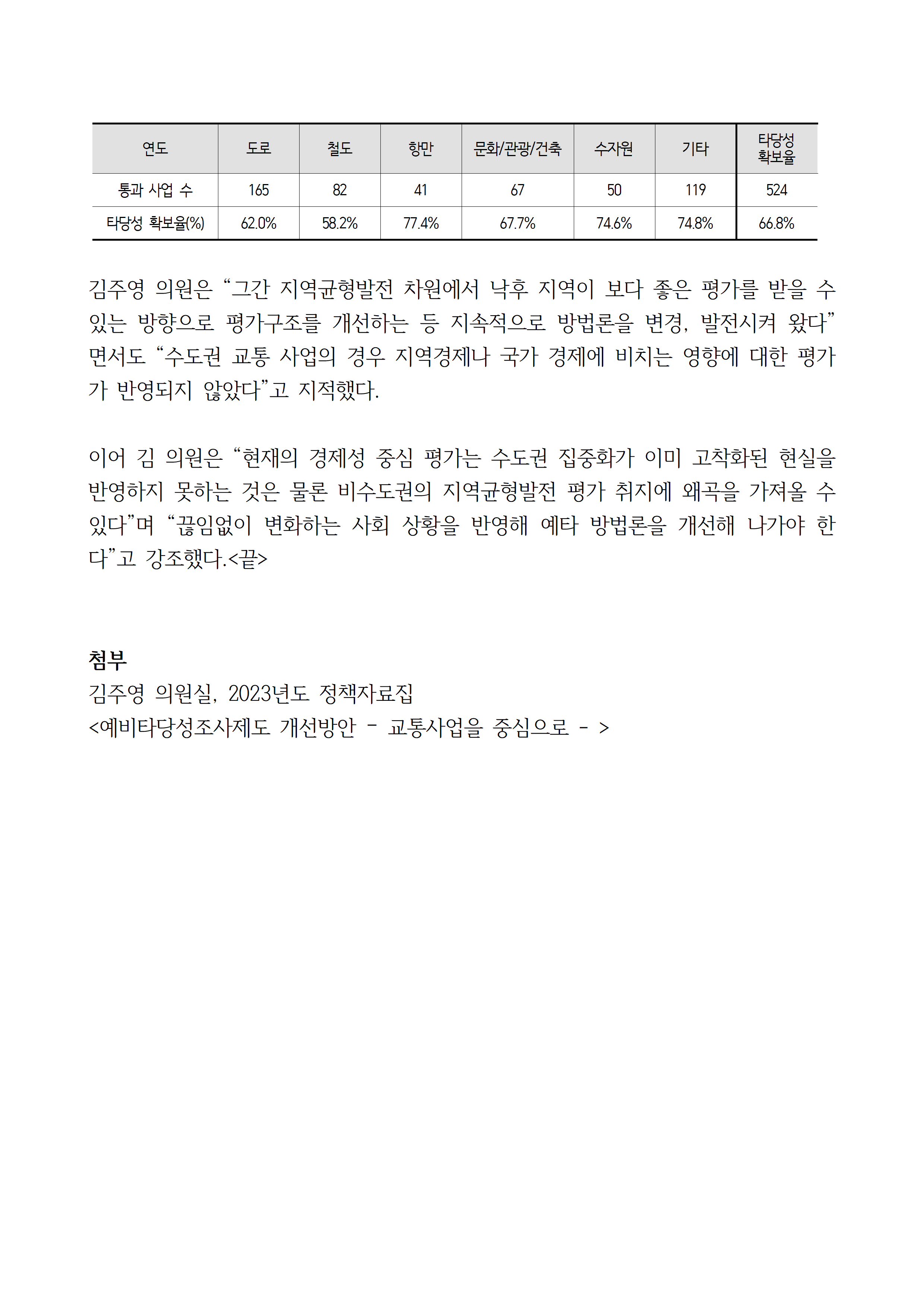 [김주영 의원 국감보도자료] <예타조사의 현주소와 개선방안 ③>지역경제 파급 효과 큰 수도권 사업에 경제성 비중 축소·경제 파급 효과 반영 필요