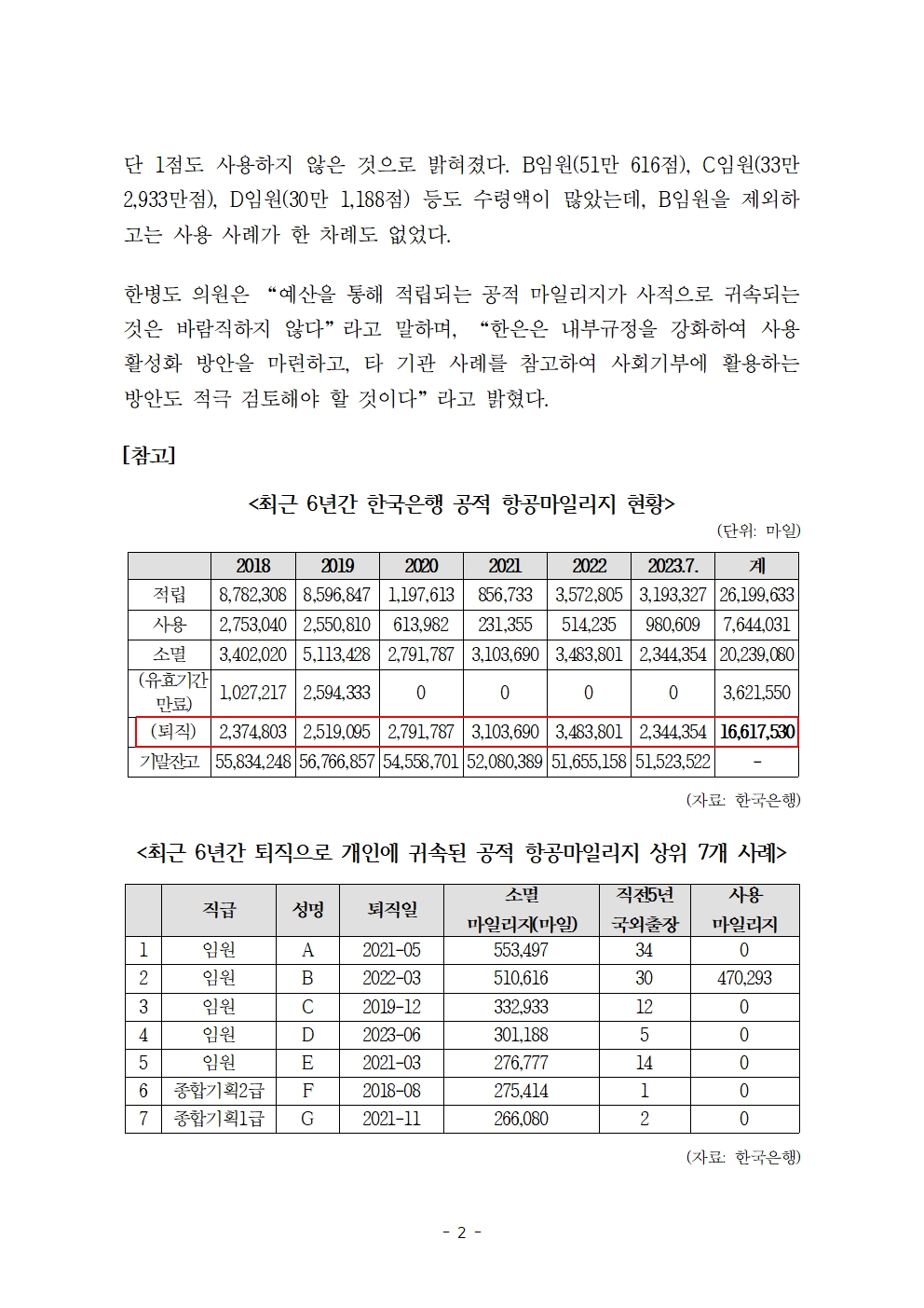 [한병도의원]2023기재위국정감사보도자료(36)_공적 항공마일리지가 ‘퇴직금’으로... 한은 직원 6년간 1661만점 챙겨나가.hwp
