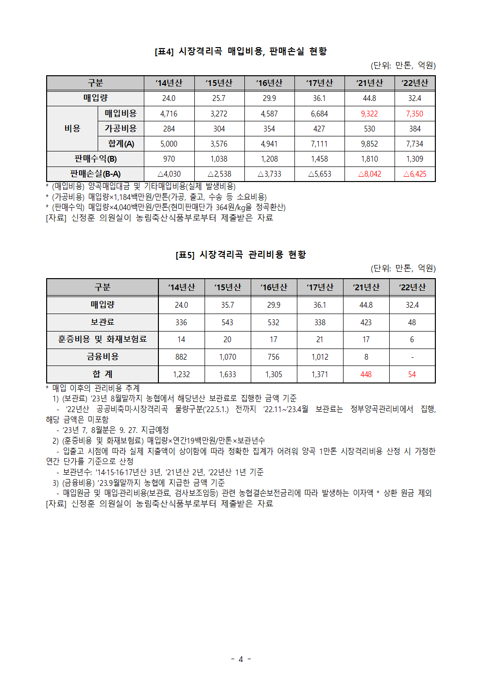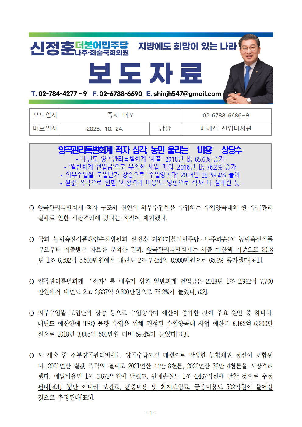 [신정훈 의원 보도자료] 양곡관리특별회계 적자 심각, 농민 울리는 ‘비용’ 상당수