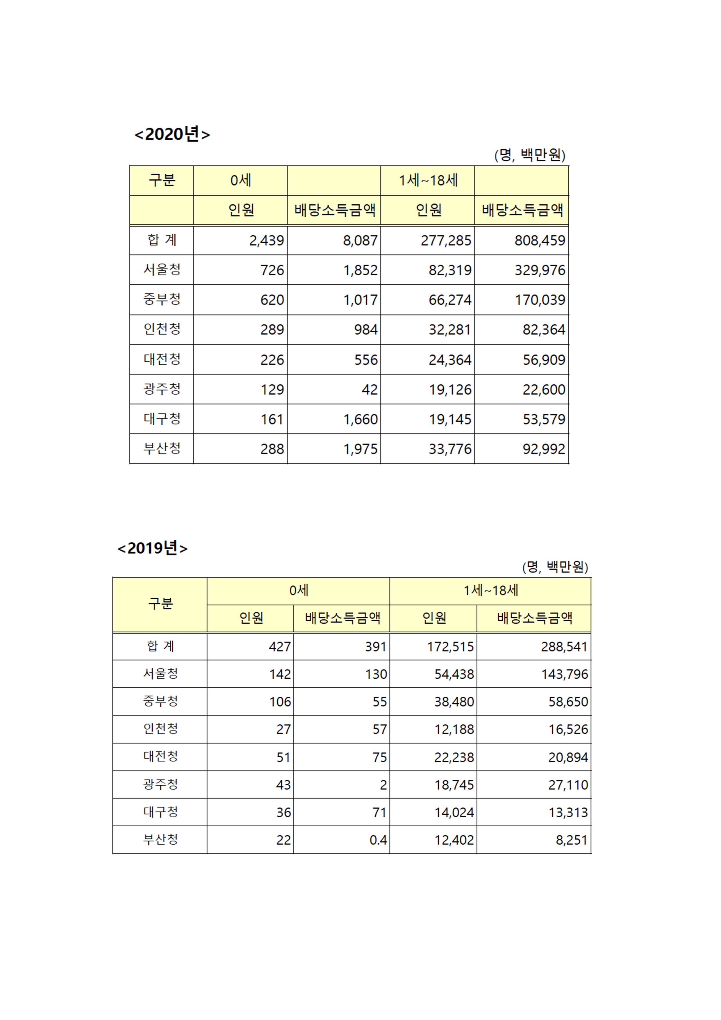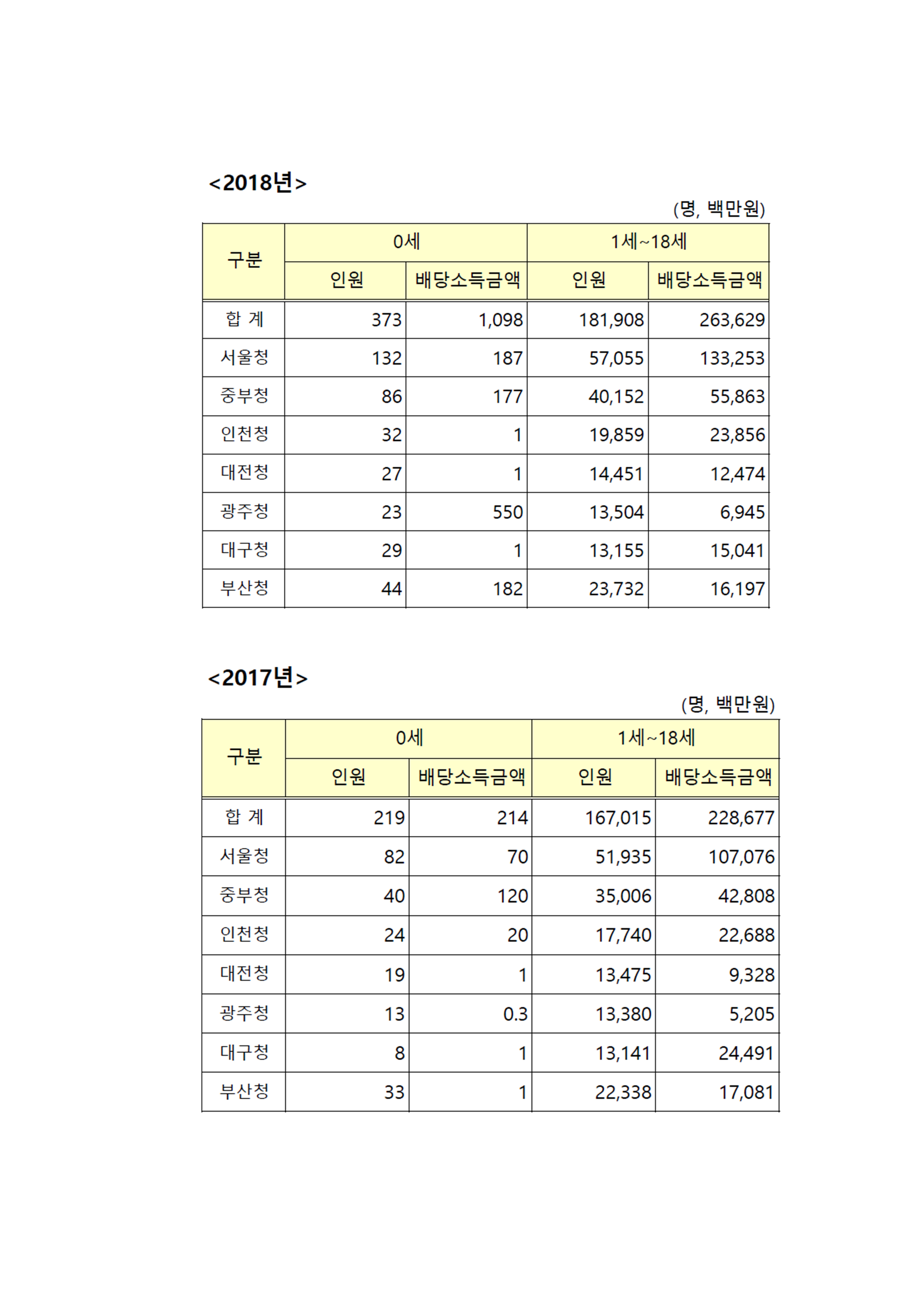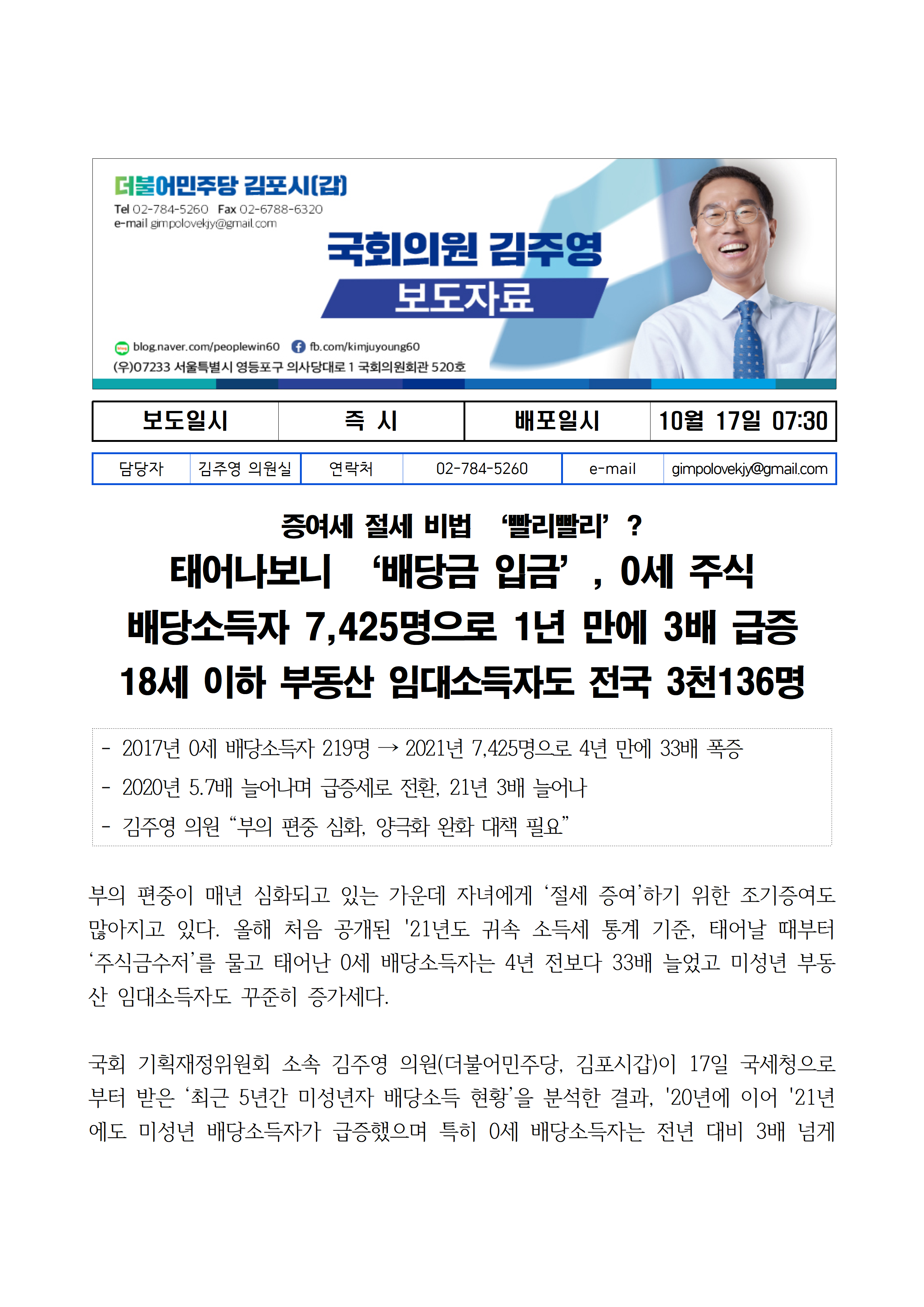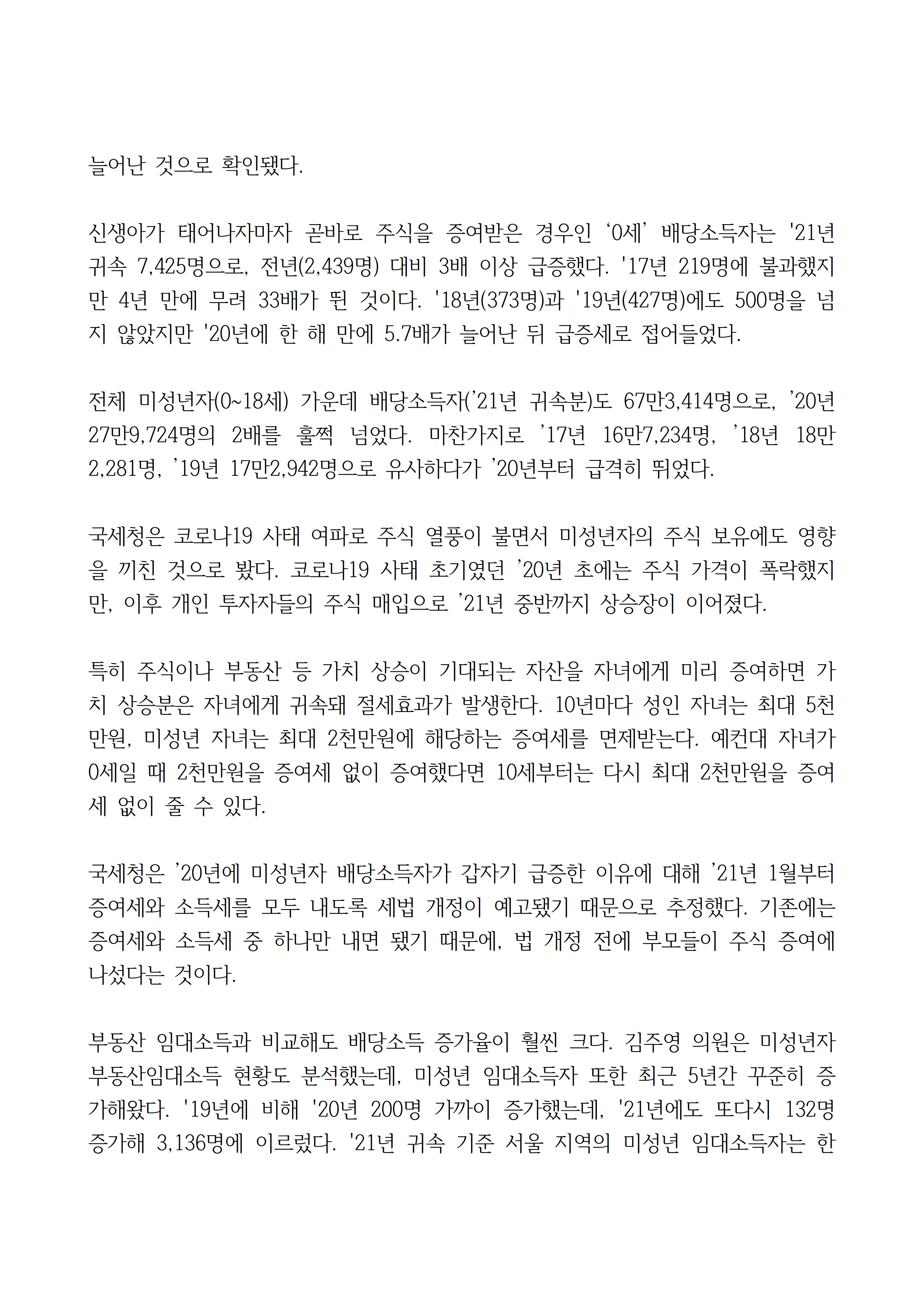[김주영 의원 국감보도자료]증여세 절세 비법 ‘빨리빨리’? 태어나보니 ‘배당금 입금’, 0세 주식 배당소득자 7,425명으로 1년 만에 3배 급증
