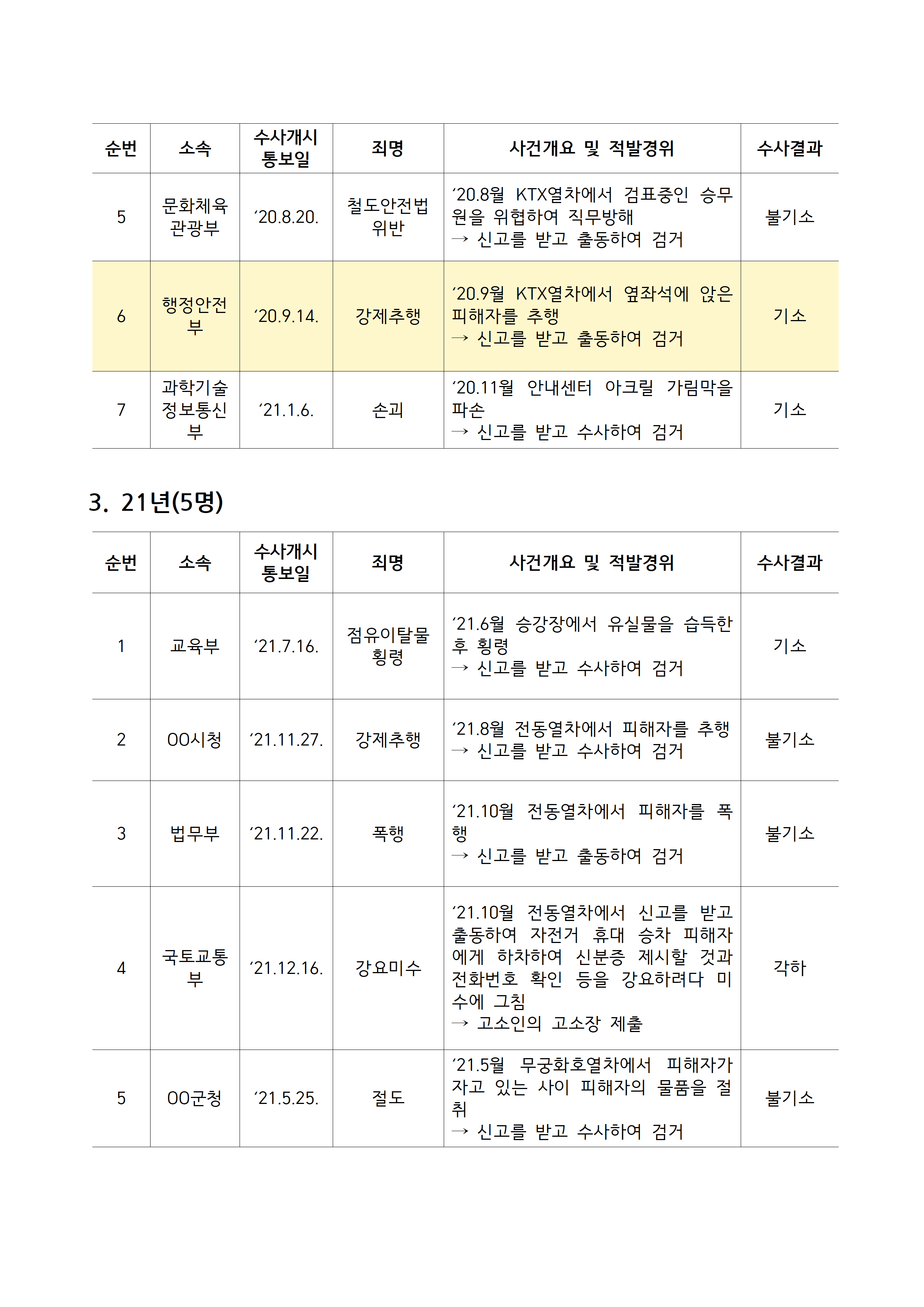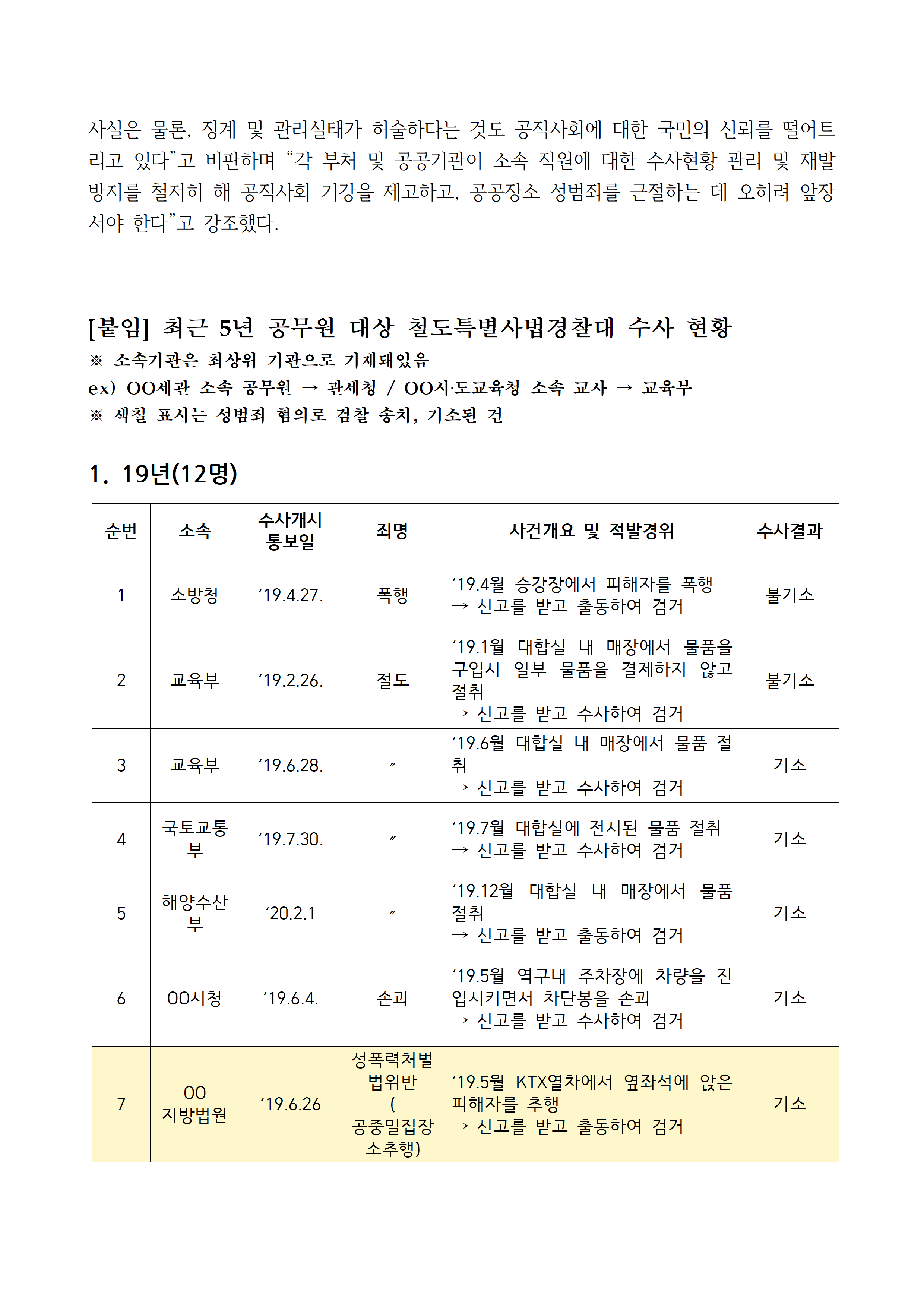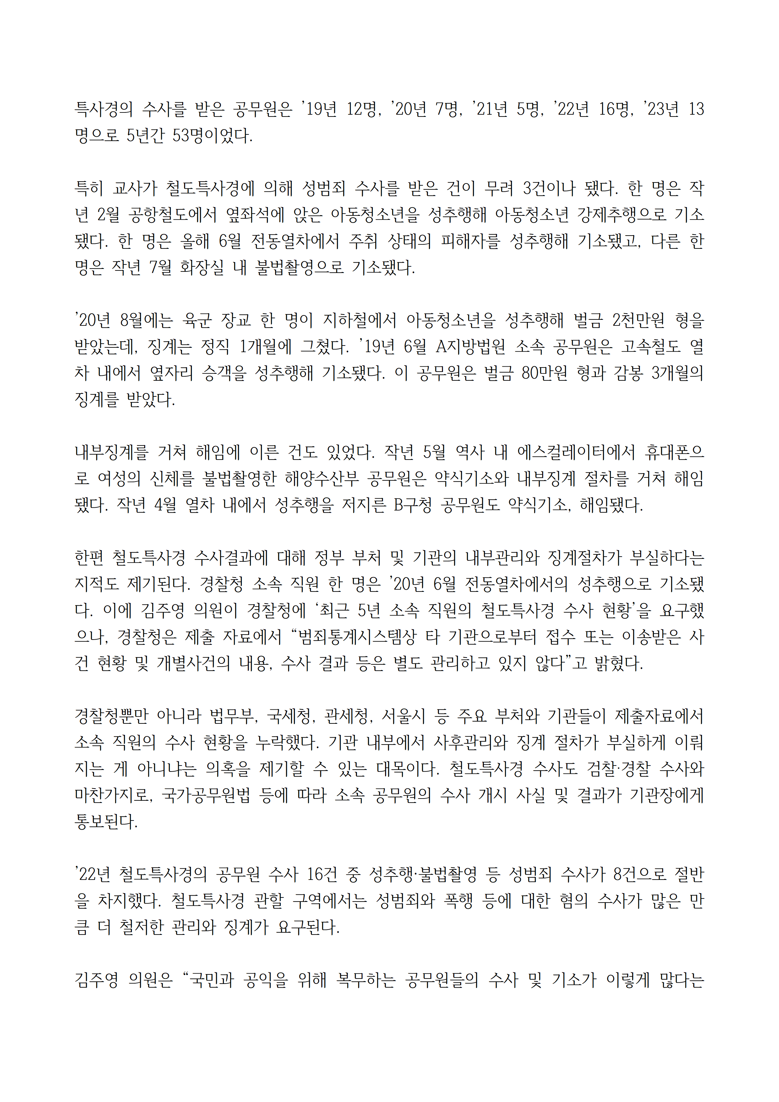 [김주영 의원 국감보도자료] <공무원 기강 해이, 징계 관리도 부실> 최근 5년간 철도특사경 수사 받은 공무원 53명 3명 중 1명 성추행•불법촬영 등 성범죄로 기소