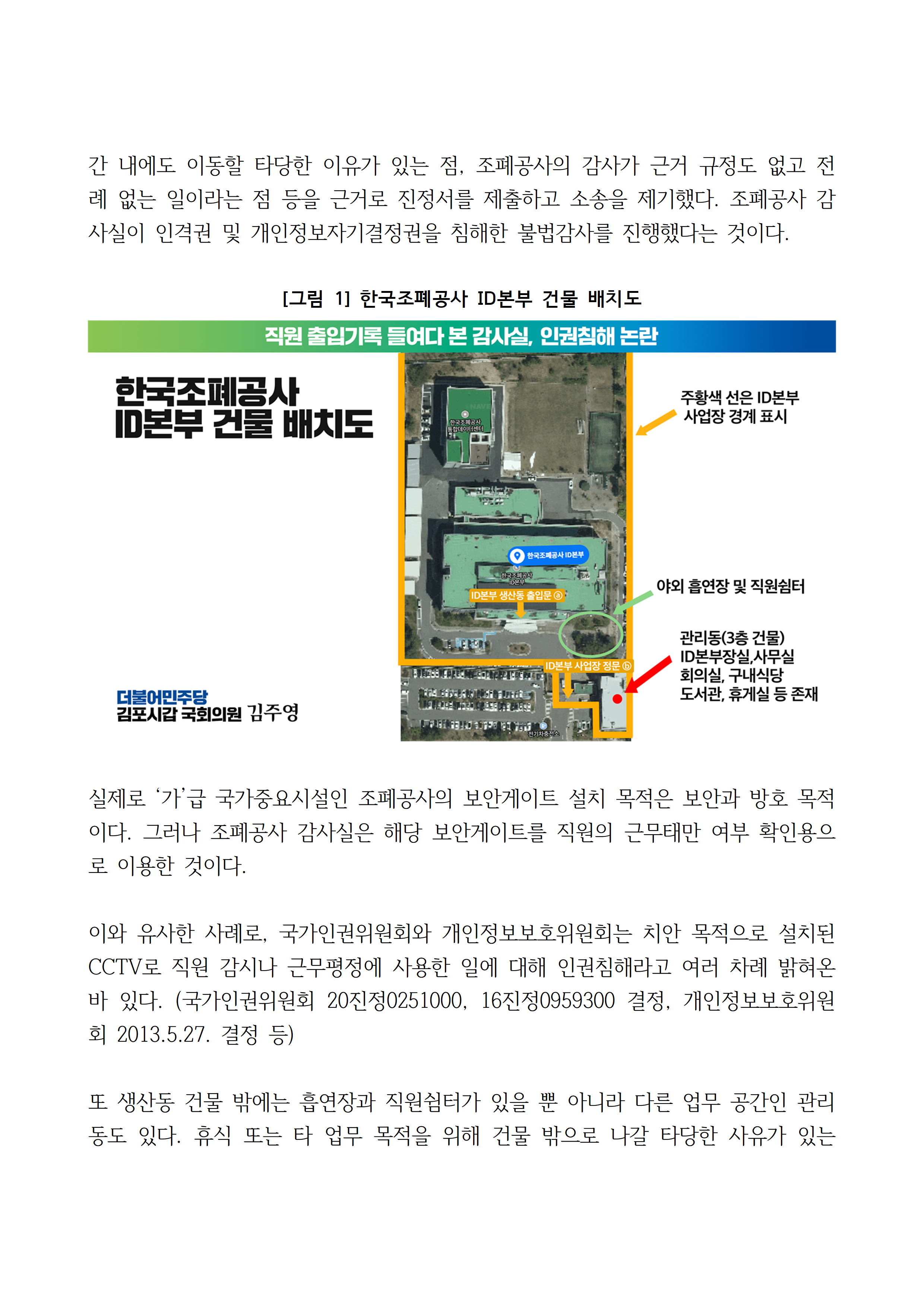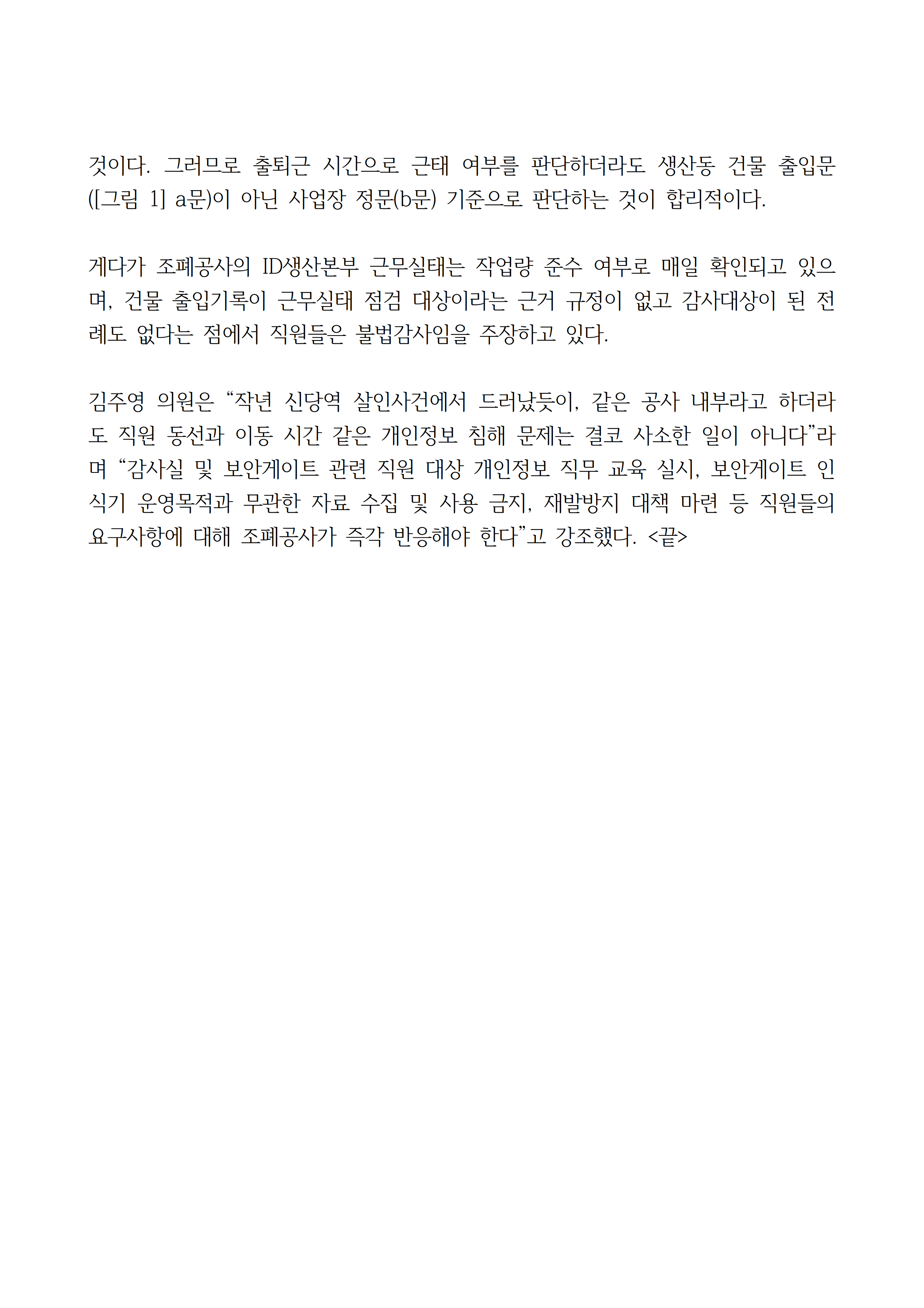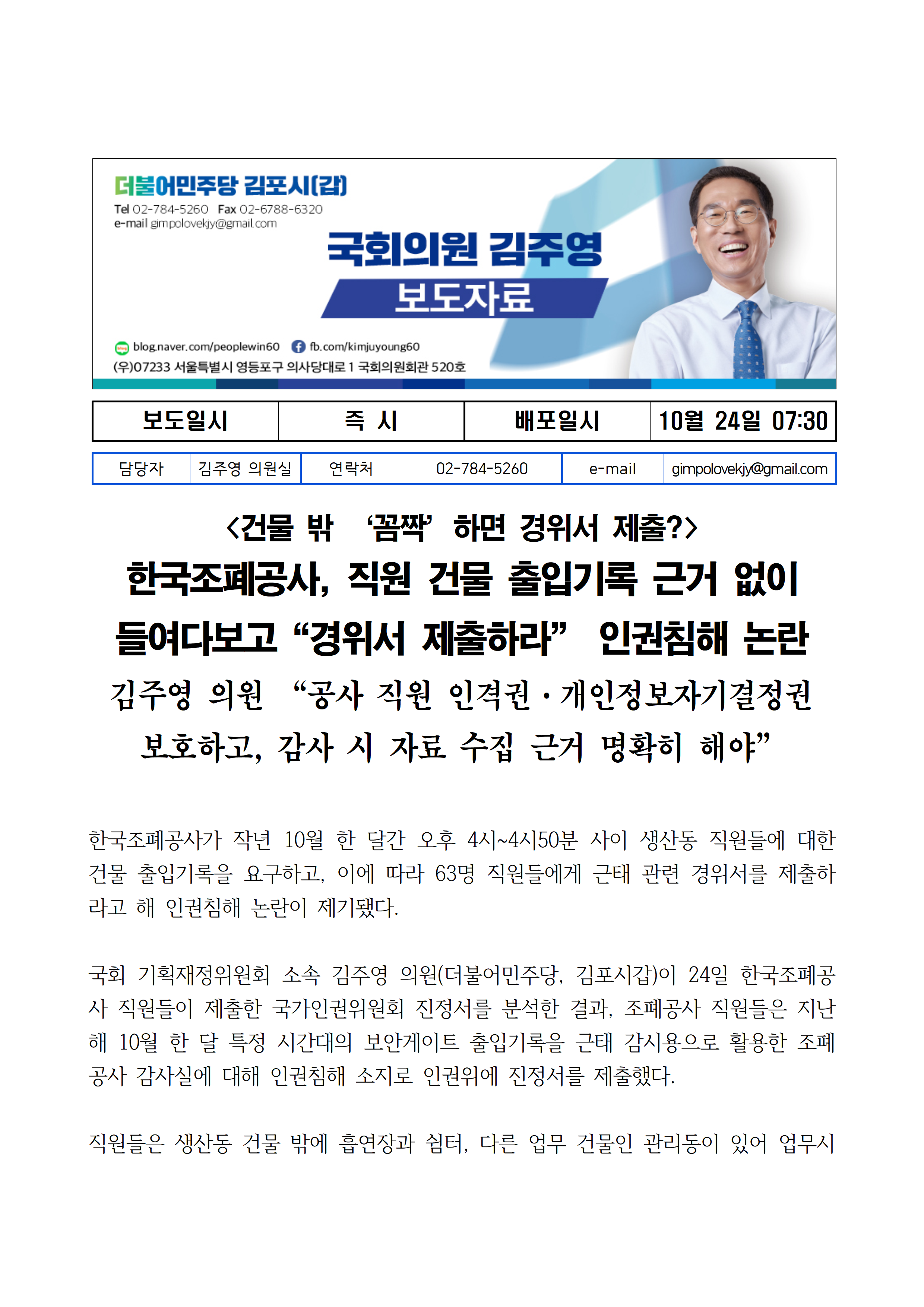 [김주영 의원 국감보도자료] <건물 밖 ‘꼼짝’하면 경위서 제출?> 한국조폐공사, 직원 건물 출입기록 근거 없이 들여다보고“경위서 제출하라” 인권침해 논란