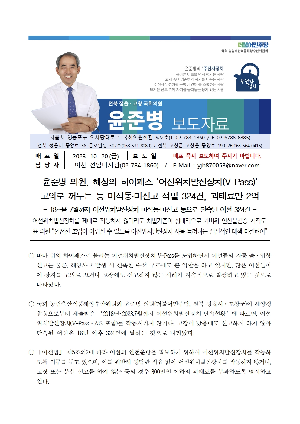 231020 [윤준병 의원 국정감사 보도자료] 윤준병 의원 어선위치발신장치 미작동·미신고 적발 5년간 324건.hwp