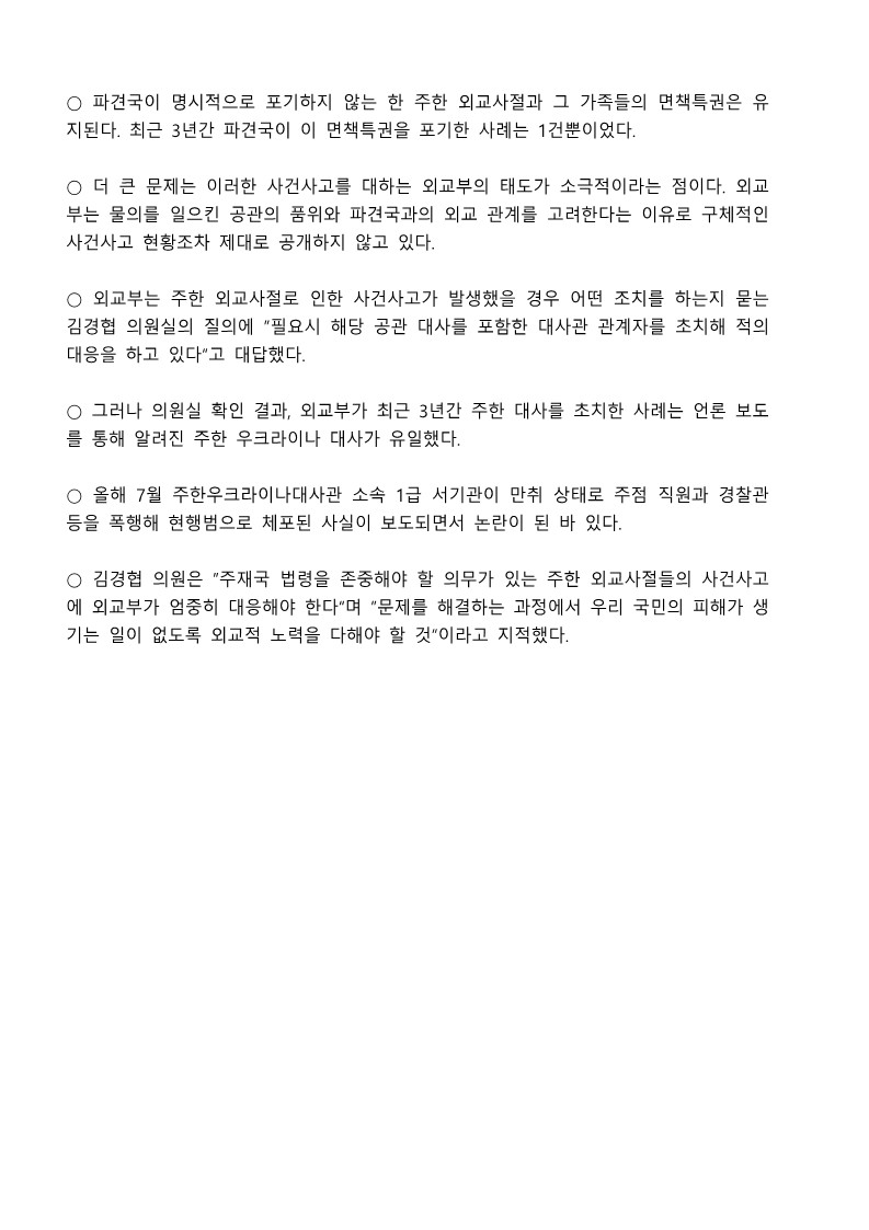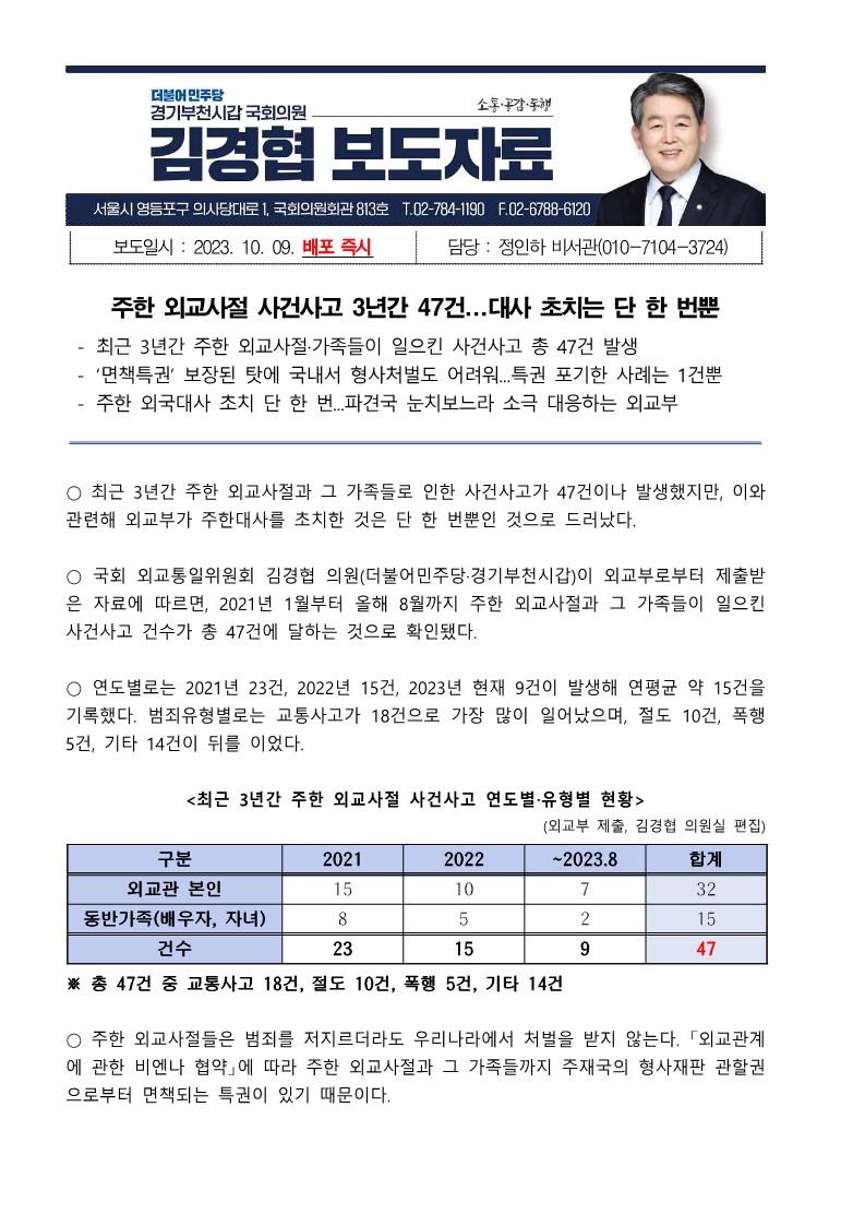 [국회의원 김경협 국정감사 보도자료] 주한 외교사절 사건사고 3년간 47건...대사 초치는 단 한 번뿐