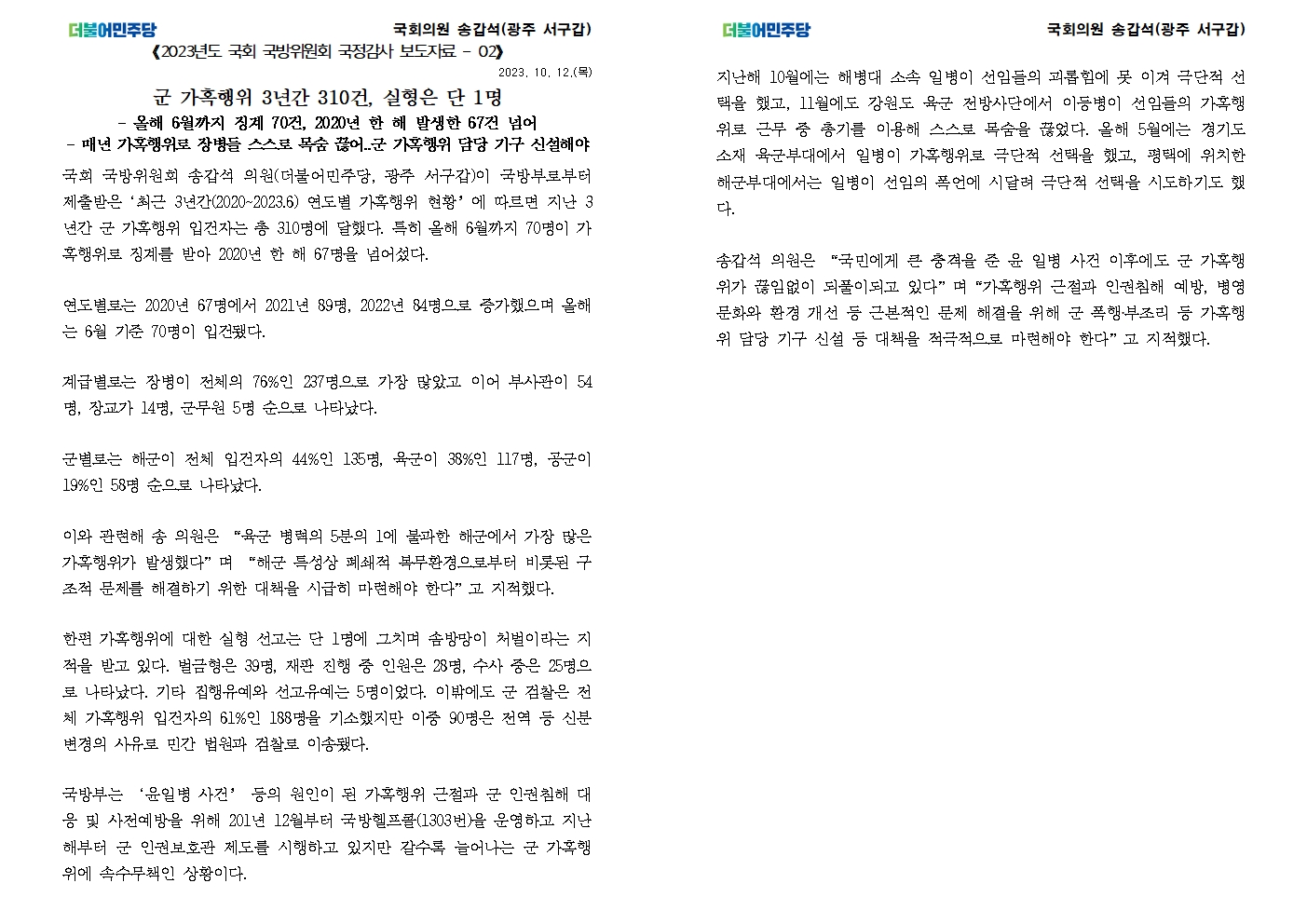 [국회의원 송갑석 국정감사 보도자료] 군 가혹행위 3년간 310건, 실형은 단 1명