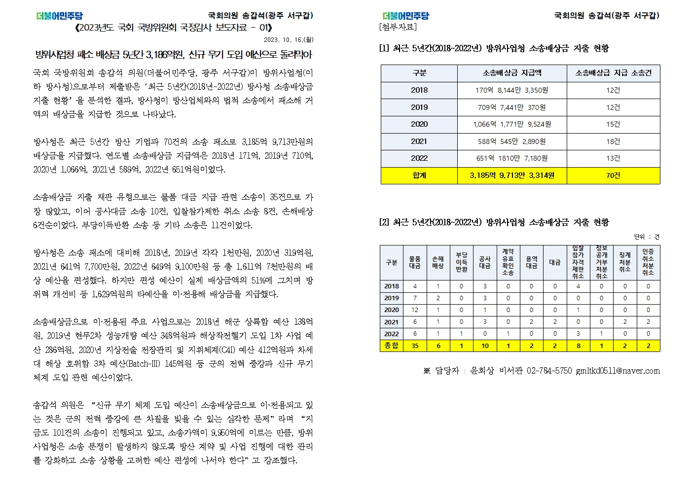 [국회의원 송갑석 국정감사 보도자료] 방위사업청 패소 배상금 5년간 3,186억원, 신규 무기 도입 예산으로 돌려막아