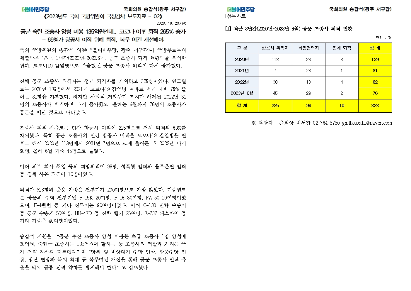 [국회의원 송갑석 국정감사 보도자료] 공군 숙련 조종사 양성 비용 135억원인데.. 코로나 이후 퇴직 265% 증가